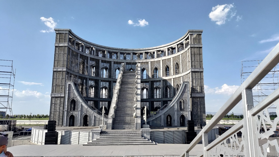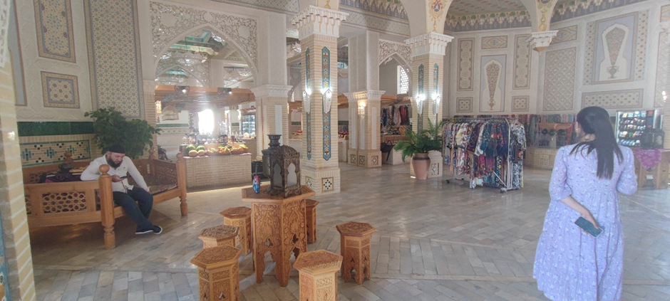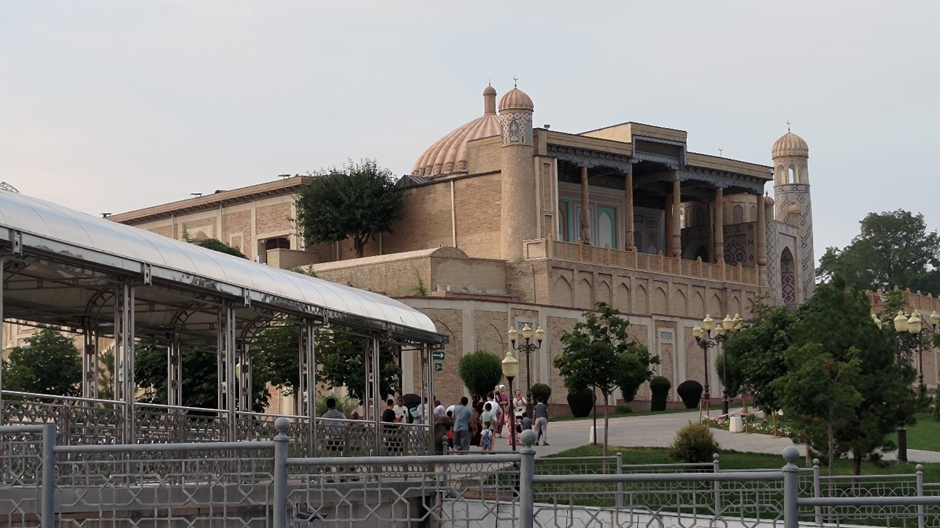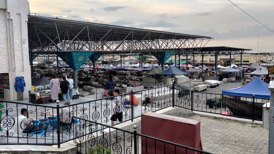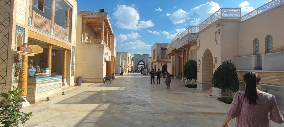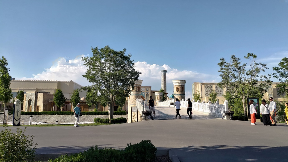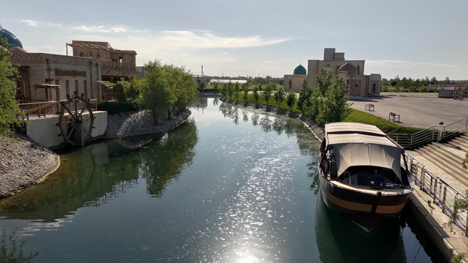 Nach der ruhigen und relativ kühlen Nacht merkten wir gleich frühs, dass dieser Tag auch heiß wird. Wir blieben also wieder bis zum Spätnachmittag im Auto. Um 4 Uhr kam Humo zu uns und wir fuhren mit seinem Auto zu New Samarkand, was er uns unbedingt zeigen wollte. Wir fuhren raus aus der Stadt zu einem neuen Entwicklungsgebiet, dessen Eingang mit einer Schranke abgesperrt war. Was uns drinnen erwartete, war unglaublich. Wir waren schockiert, aber leider nicht im positiven Sinne. Hier wurde eine komplette „Fake-Altstadt“ aufgebaut, mit Brücken, türkisgefließter „Moschee“ und anderen „historischen“ Gebäuden. Alle waren befüllt mit Restaurants oder Souvenirladen. Alles war komplett neu und künstlich, uns hat es überhaupt nicht gefallen. Rundum dieses „Disneyland“ standen viele große Hotels und ein Wasserpark wurde gerade gebaut. Alles für die Touristen, wie Humo sagte. Wir haben versucht, ihm nicht verletzend zu erklären, warum wir diesen Ort nicht mögen und was wir an Samarkand (der echten Altstadt) schätzen.