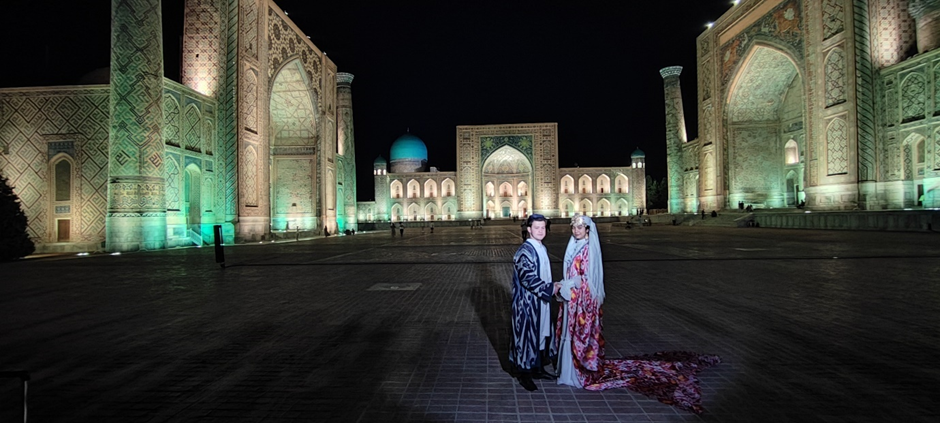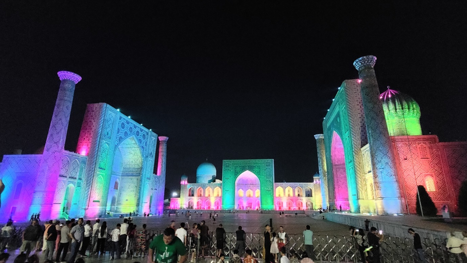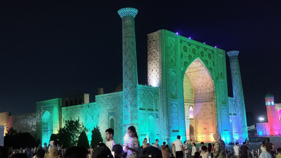 Da wir gehört haben, dass um 9 Uhr am Registan ein Lichtshow stattfindet, liefen wir gemeinsam nochmal dort hin. Jetzt war der Vorplatz noch voller mit Touristen als am Nachmittag und die 3 wunderschönen Medressen waren mit bunten Lichtern beleuchtet.