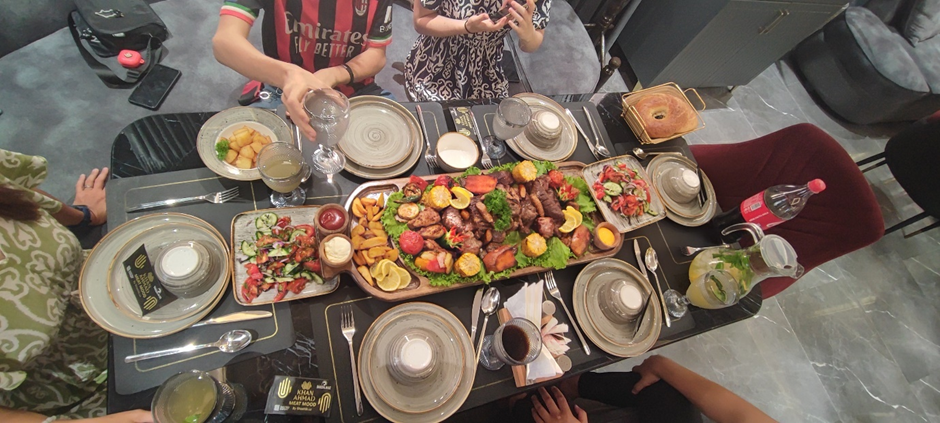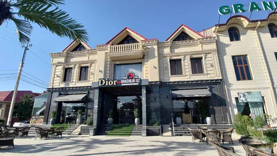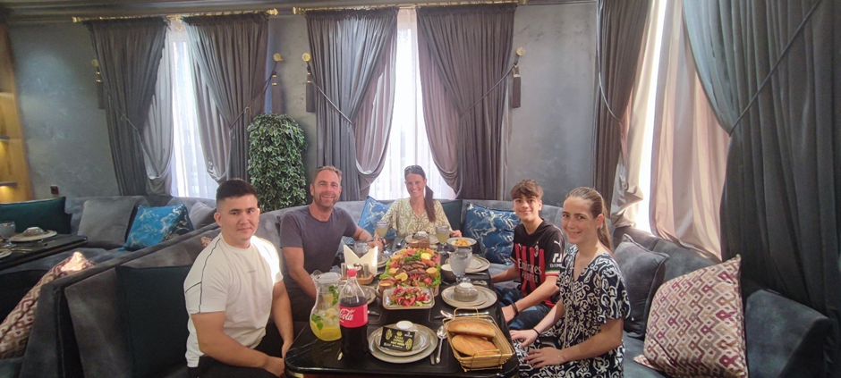 Bevor wir morgen abreisen, wollten wir uns bei Humo irgendwie für seine Gastfreundschaft bedanken. Deshalb haben wir ihn und seine Familie schon gestern Abend für heute zum Abendessen eingeladen. Wir haben Humo gebeten, ein Restaurant für uns zu empfehlen, wo er (und andere Einheimische) gerne essen gehen, ein echtes usbekisches Restaurant, nicht ein nur für Touristen. Seine Mama und seine Schwester konnten leider nicht kommen, aber Humo fuhr mit uns nach dem New Samarkand zu einem tollen Schaschlik Restaurant, wohin er regelmäßig mit seiner Familie hingeht. Wir bestellten verschiedene Schaschlik mit Salaten und Kartoffeln. Alles schmeckte vorzüglich und wir verbrachten zusammen einen richtig schönen Abend.