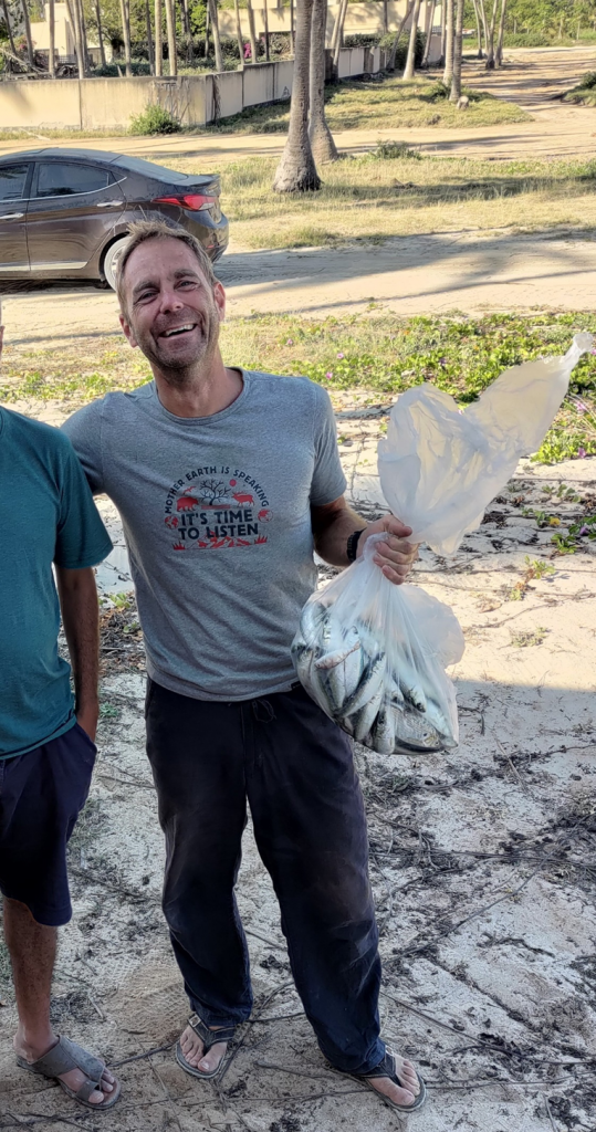 Ein Auto von den Fischern ist im Sand bei uns stecken geblieben und die Männer haben ihnen geholfen, rauszukommen. Als Dank haben die Fischer uns nachher Kokosnüsse, kleine Bananen und einen Sack voll mit frischen Sardinien gegeben. Ich meine einen RIESEN Sack voll mit ganz viel Fisch!