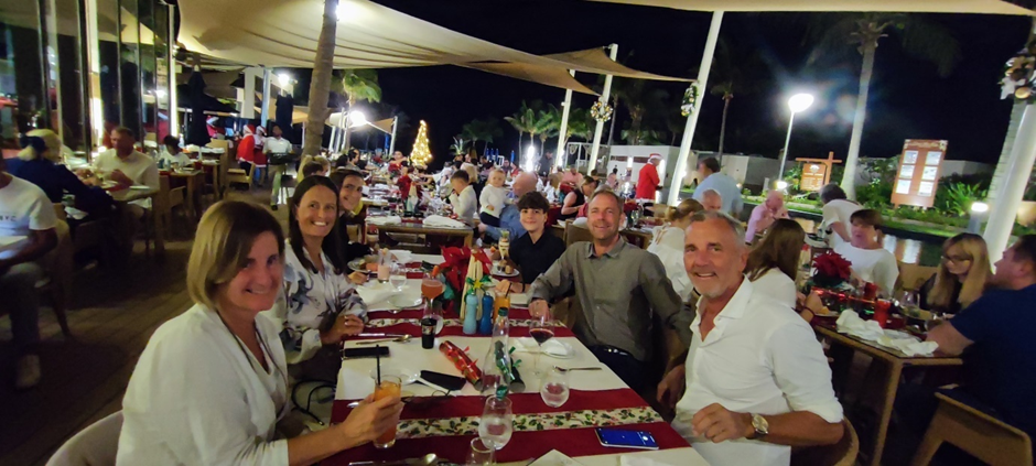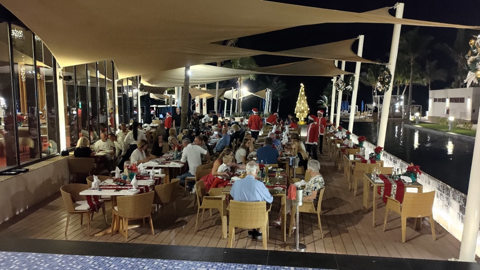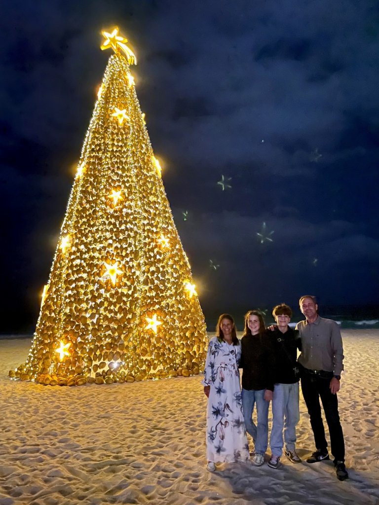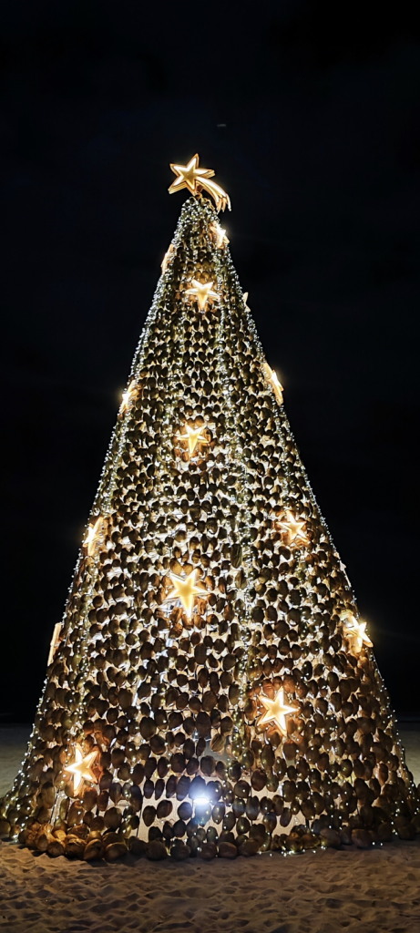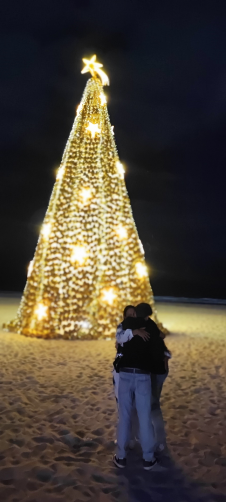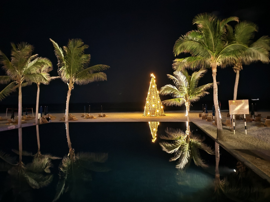 Nach dem Essen sind wir ein bisschen zur Seite gegangen, um in Ruhe mit meiner Familie sprechen zu können. Wir saßen auf einer Liege am Pool, hinter uns war der Strand mit einem tollen, beleuchteten Weihnachtsbaum aus Kokosnüssen.