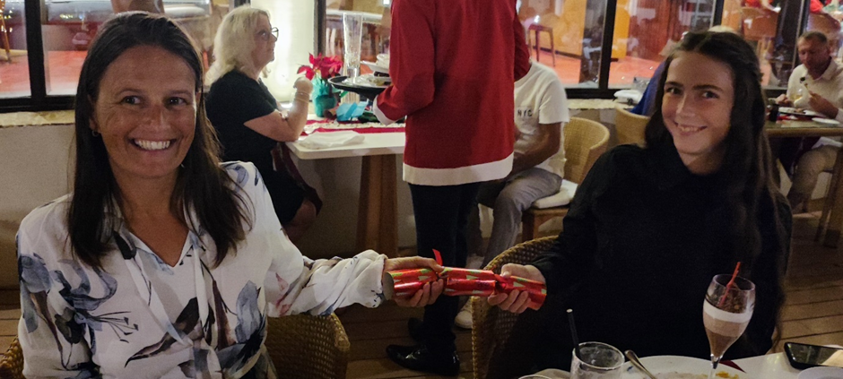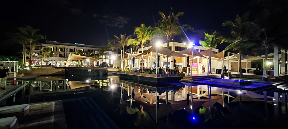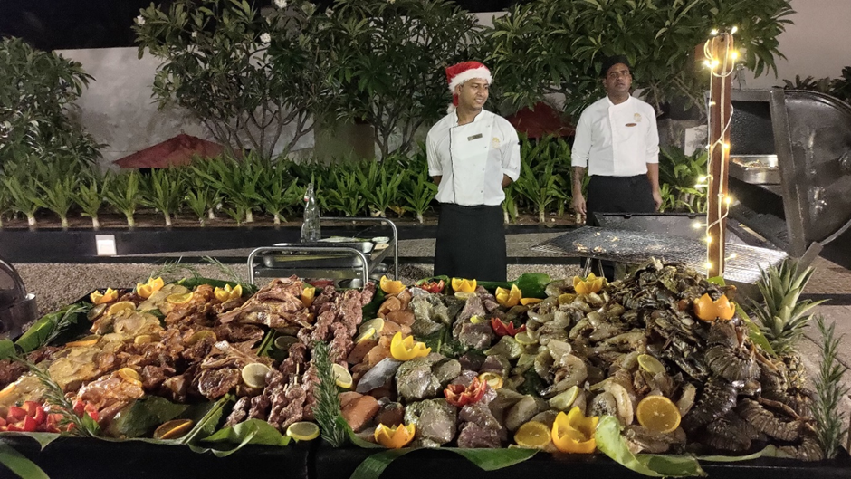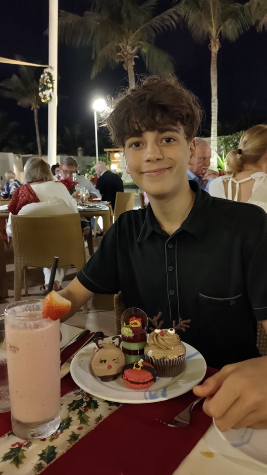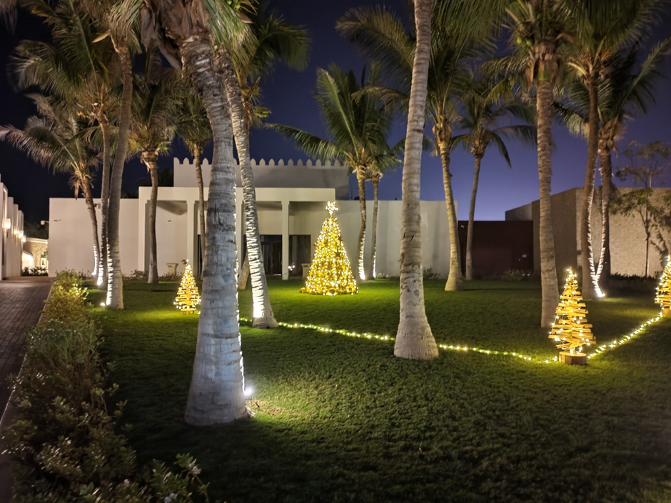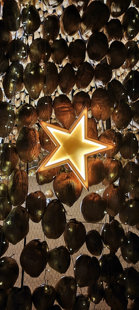 Nach dem Essen sind wir ein bisschen zur Seite gegangen, um in Ruhe mit meiner Familie sprechen zu können. Wir saßen auf einer Liege am Pool, hinter uns war der Strand mit einem tollen, beleuchteten Weihnachtsbaum aus Kokosnüssen.