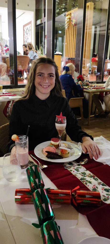 Auf dem Tisch waren „Cracker“, die man ziehen konnte und drinnen fanden wir kleine Geschenke wir ein Kuli oder Spitzer.