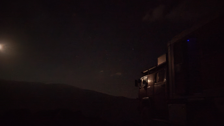 Wir wollten heute Abend aber nicht zum Dorf und auch nicht zum Gipfel (der sowieso militärisches Sperrgebiet ist), sondern auf die andere Seite zu den Klippen, direkt über dem Canyon. Der Weg war unglaublich steil und kurvig, wir sind in ca. 12 km 1500 Höhenmeter hochgefahren. Erstmal auf Asphalt danach auf Schotterpisten. Es war schon dunkel, als wir zwischen zwei anderen Fahrzeugen direkt am Felsrand geparkt haben. Der Aussicht war auch nachts phänomenal.