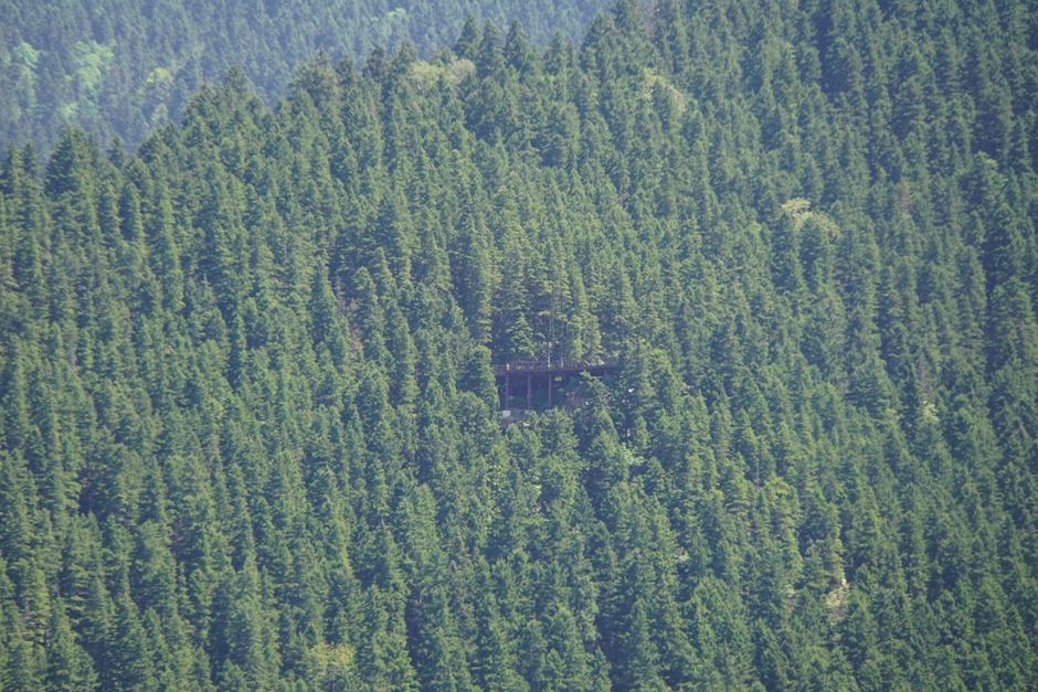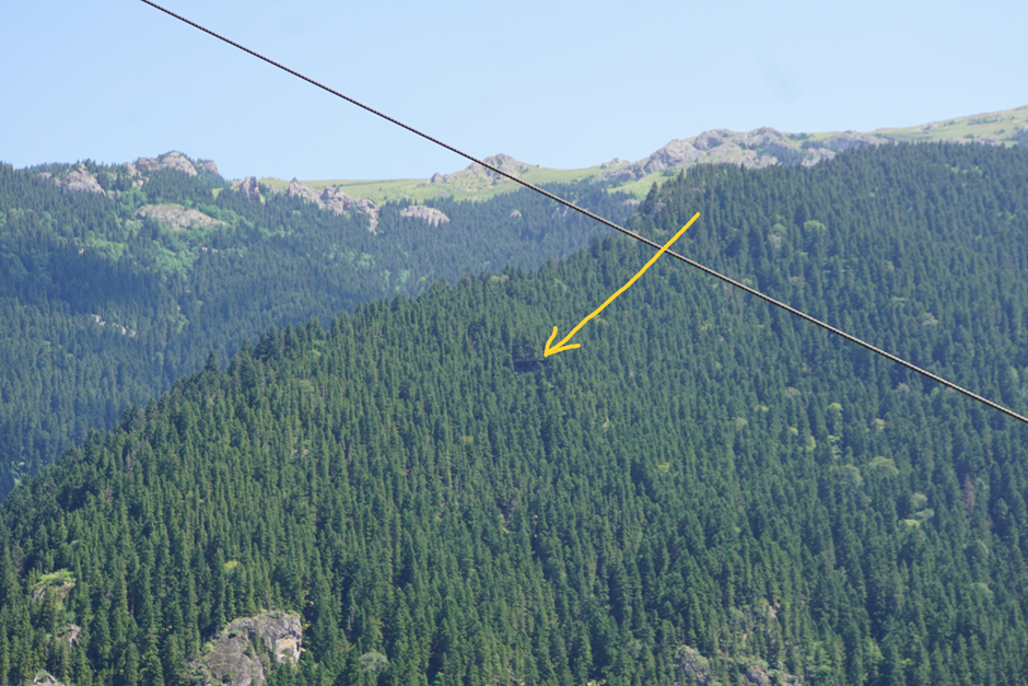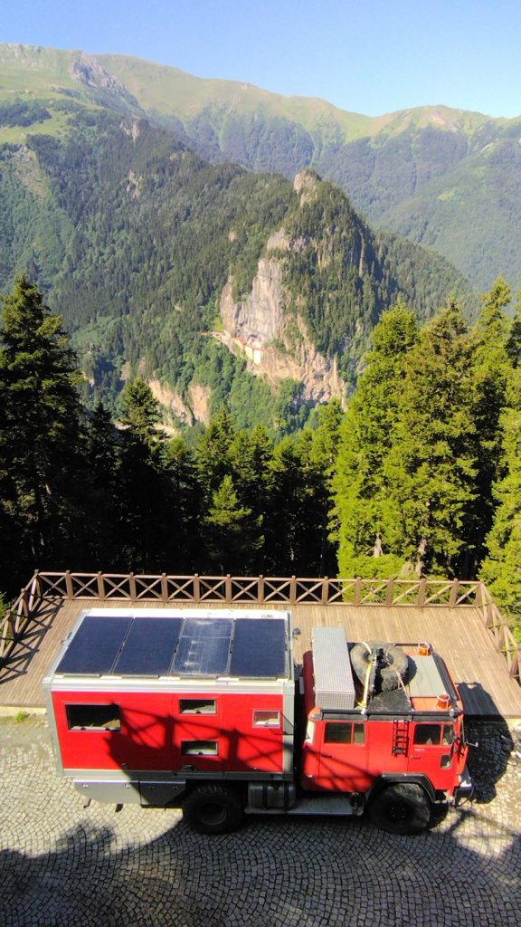 Als wir fertig waren, fuhren wir wieder vom Berg runter. Wir parkten kurz vor dem offiziellen Parkplatz (der war kostenpflichtig), kauften Karten für den Shuttlebus, der uns nach oben zum Sumela Kloster fahren sollte. Als wir bei den oberen Parkplatz ankamen, ahnten wir, dass im Kloster viele Touristen sein werden. Vor der Kasse, wo wir die Tickets für den Kloster erwarben hatte man einen guten Aussicht auf die andere Seite, wo wir die letzte Nacht verbracht haben. Sieht ihr das kleine, schwarze Loch im dichten Wald? Dort oben standen wir.