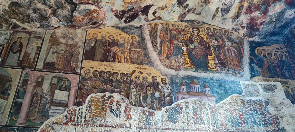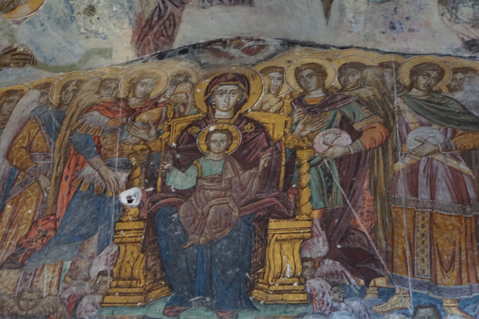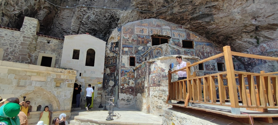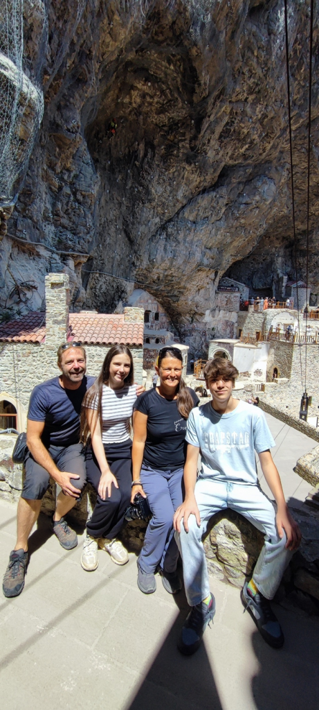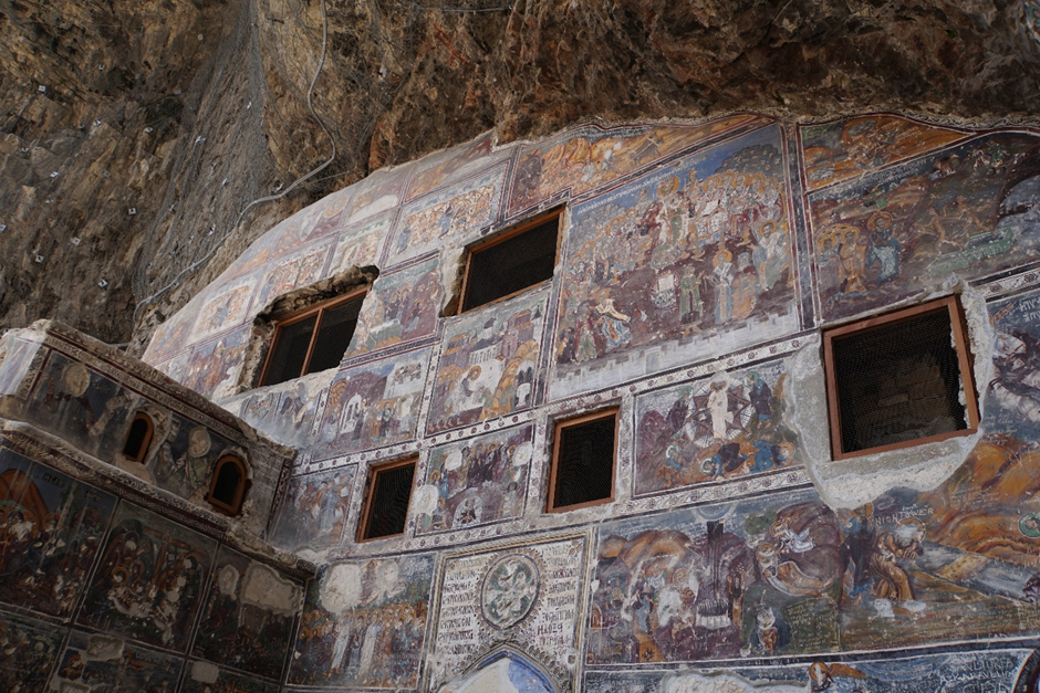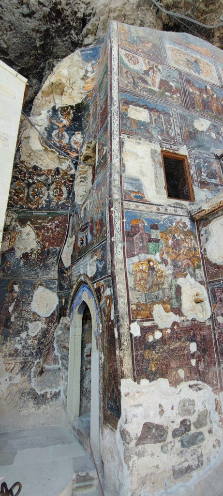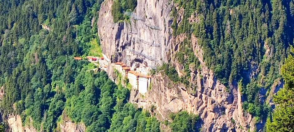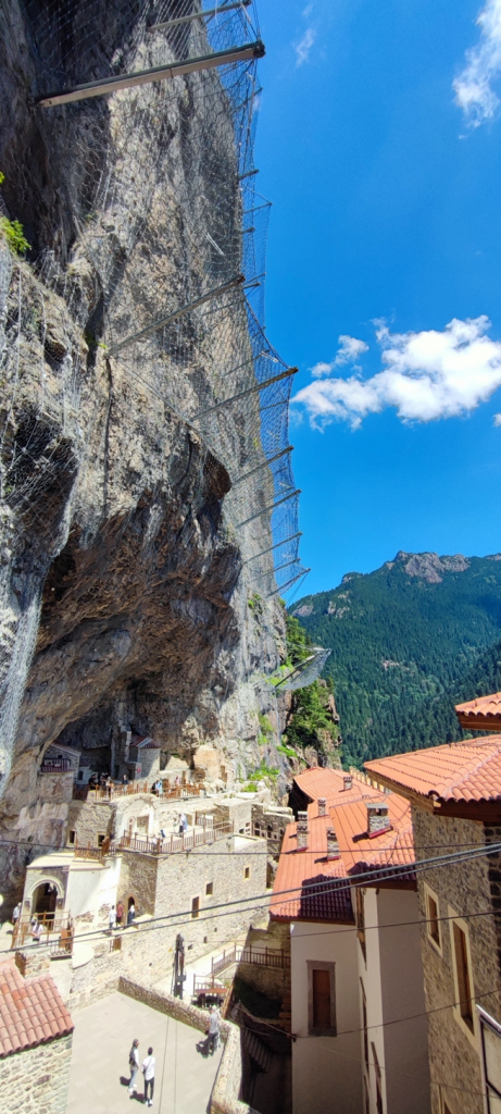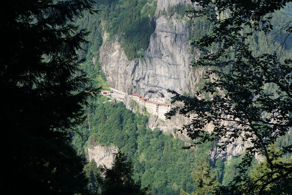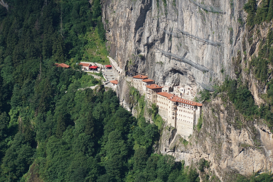 Der Sumela Kloster ist ein ehemaliges griechisch-orthodoxes Kloster aus byzantinischer Zeit. Der Legende nach wurde die Ikone, die vom Evangelisten Lukas selber gemalt worden sein soll, nach dessen Tod von zwei Engeln durch die Wolken in eine Höhle im – damals – Pontischen Gebirge getragen. Zwei junge Eremiten aus Athen, Barnabas und sein Neffe Sophronios, wurden ebenfalls von den Engeln zu der Wanderschaft eingeladen und entdeckten die Ikone in einer Höhle mitten im Wald bei Wasserfällen. Das war vermutlich im Jahr 385 und die Höhle war bereits, wie so viele, von frühchristlichen Eremiten bewohnt. Die Höhle wurde erweitert und eine Kapelle hineingebaut. Die ältesten erhaltenen Gebäude stammen aus der Komnenenzeit. Auch nach der Eroberung durch die Osmanen im Jahr 1461 blieb das Kloster bestehen und entwickelte sich zu einem wichtigen Wallfahrtsort. Sein heutiges Aussehen erhielt das Kloster im 19. Jahrhundert, als Gebäude mit Mönchzellen vor die eigentliche Felsenkirche gebaut wurden. Als nach dem Ersten Weltkrieg die griechische Bevölkerung auf dem Pontos bei dem Versuch, eine eigene Republik zu gründen, den Truppen Atatürks unterlag, mussten auch die Mönche 1926 das Kloster verlassen (Da war der Griechisch-Türkische Bevölkerungsaustausch, wovon wir schon erzählt haben, als wir auf dem Hinweg in die Türkei waren.)