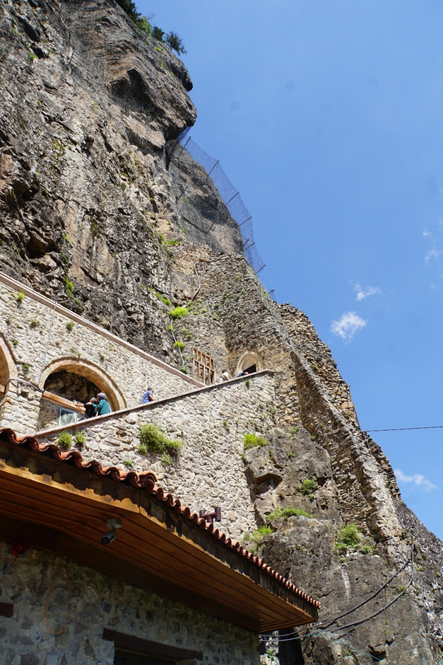 Wir liefen auf den vielen Treppen zum Eingang des Klosters. Über uns türmte die riesige, senkrechte Felswand, die nach der letzten Restaurierung (zum Glück) stark befestigt wurde. Davor zerstörten und beschädigten herunterfallende Steine und Felsbrocken immer wieder die Gebäude des Klosters.