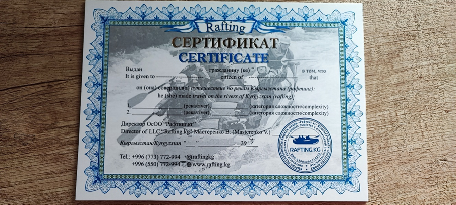 Wir hatten ein Gummiboot für uns alleine mit zwei Begleitern. Zwei andere Boote waren vor uns mit den anderen Touristen. Der Tschüi Fluss, worauf wir uns befanden, war kalt und sehr schnell. Es gab viele Stromschnellen und Gegenwellen, worin wir mit dem kleinen Boot komplett eintauchten. Wir mussten als Team zusammenarbeiten und die Anweisungen von Matvei (unserem Kapitän) folgen. Wir waren schnell komplett nass, aber in den Neoprenanzügen war es uns nicht kalt. Unsere 2 Begleiter haben an ruhigeren Teilen unser Boot im Kreis drehen lassen und wir fuhren teilweise auch rückwärts. Die Landschaft um uns herum war wunderschön. Hinter uns waren die schneebedeckten Berge und wir fuhren durch grüne Hügel mit Pferden, Kühen und Schafen. Ab und zu haben wir die Leute von der Agentur am Flussufer gesehen, wie sie uns gefilmt haben. Nach ca. 1,5 Stunden kamen wir bei unserem Endpunkt an. Hier haben wir eine Urkunde bekommen und unsere Neoprensachen ausgezogen und unser Handy und Autoschlüssel zurückbekommen, die wir zur Aufbewahrung bei dem Guide gelassen haben. Die Überraschung war, dass die Filme, die die Leute von der Agentur gemacht haben, auf Marcs Handy waren. (Wir haben gedacht, vielleicht können wir sie kaufen oder wir erhalten sie per Email.) Von dort wurden wir dann zu unserem Auto zurückgefahren.