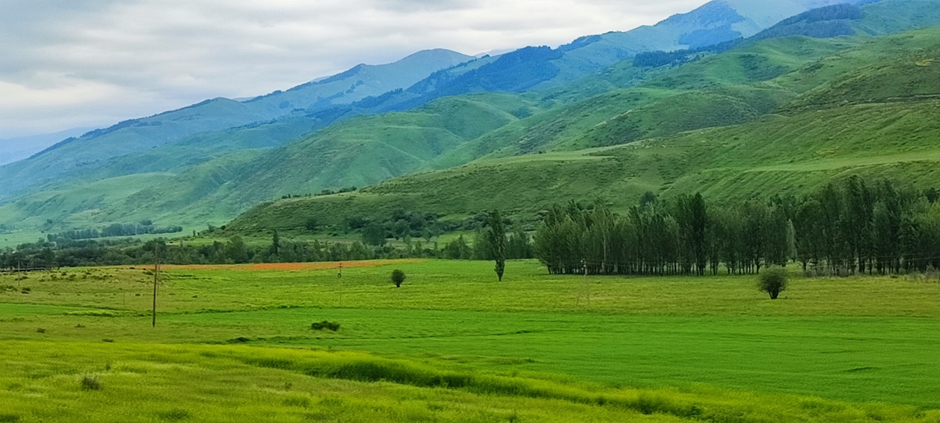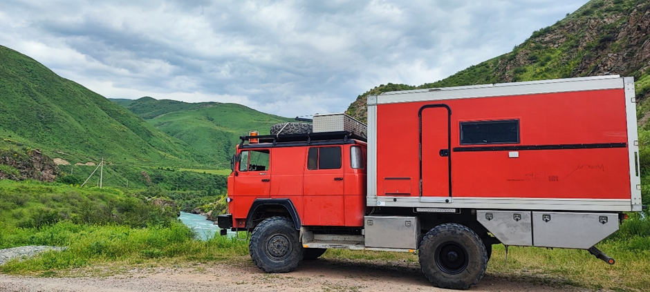 Bevor wir weitergefahren sind, musste Marc die Bremsen anschauen. Er hat heute früh gemerkt, dass irgendetwas mit denen nicht stimmte. Er hatte die Vermutung, dass in den Bremsleitungen noch Luft war. Er hat die Bremse bei der linken Hinterachse entlüftet und nach einem schnellen Mittagessen haben wir unsere Reise fortgesetzt. Wir wollten eine schönen Offroadstrecke in dem Chong Kemin Tal abfahren und an einem kleinen Bergsee am Ende des Weges übernachten. Wir waren allerdings nicht sicher, wie lange die Route dorthin ist. Die Angaben in meiner Quelle waren ein bisschen verwirrend. Als wir in das Tal reinfuhren, empfing uns eine wunderschöne Landschaft.