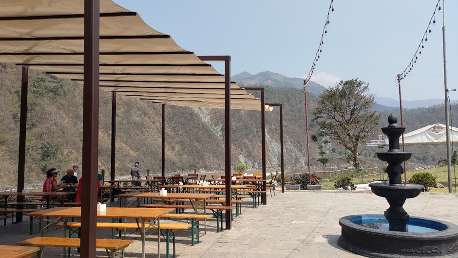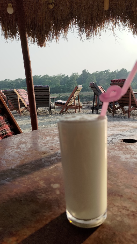 Ein Mann kam gleich auf uns zu und hat uns parken geholfen. Danach hat er angeboten, dass wenn wir Safaris buchen möchten, wir gerne zu ihm kommen können. Er war höflich und nicht aufdringlich und wir haben gleich mit ihm den nächsten Tag geplant und 2 Safaris gebucht. Frühs wollten wir eine Jeep-Safari machen und am Nachmittag den Fluss mit einem traditionellen Kanu erkunden. Wir haben auch Tickets für die Tharu Cultural Show für den heutigen Abend gekauft, der um 7:00 Uhr im Gemeindehaus stattfinden sollte. Bis zum Abend hatten wir ein bisschen Zeit. Mira wollte einen Kuchen backen und ich habe mich mit einem Buch und einem Bananenlassi im direkt neben uns liegenden Sunset View Restaurant am Flussufer hingesetzt.