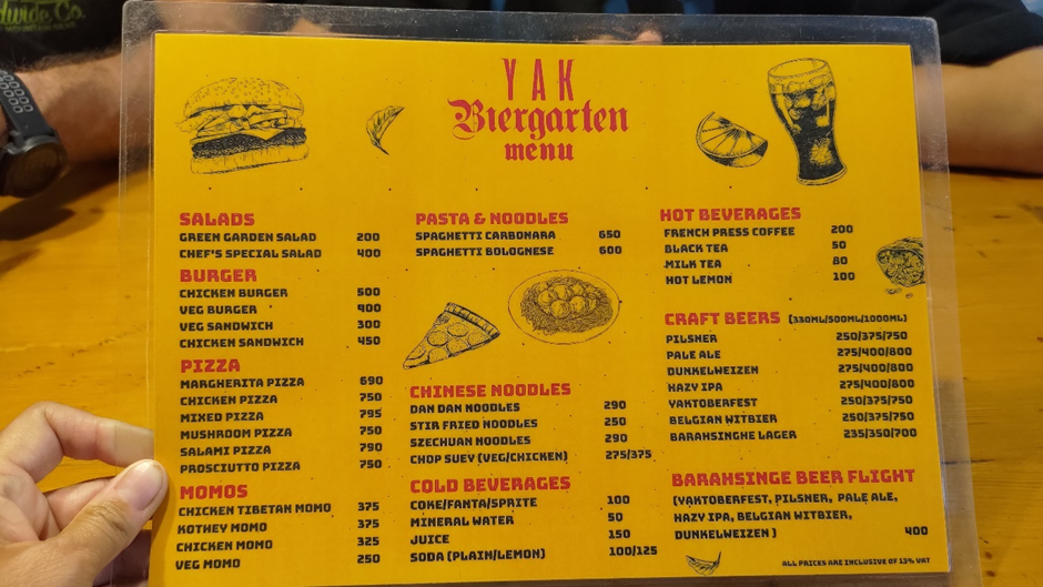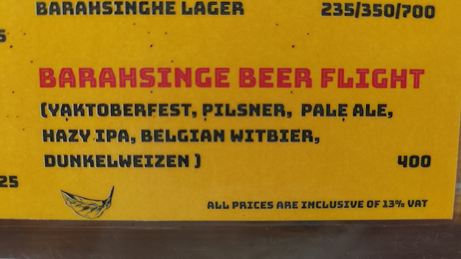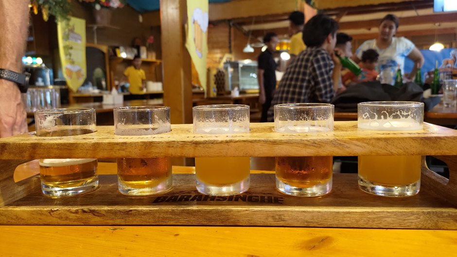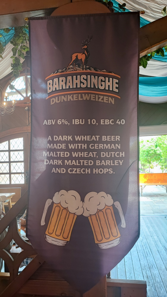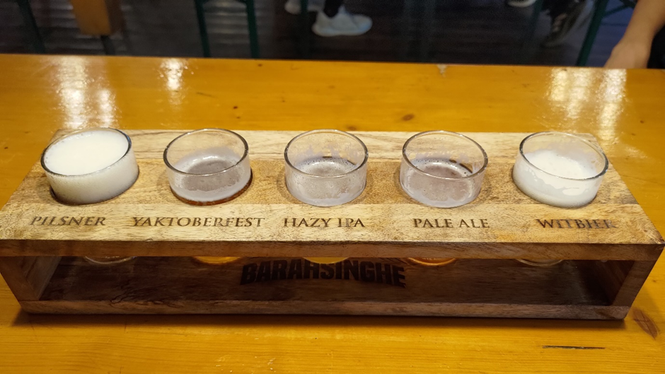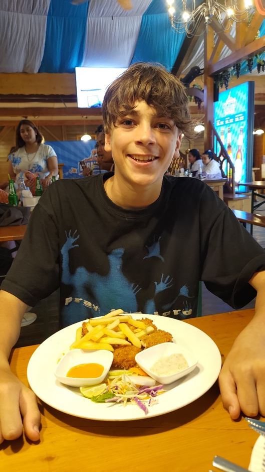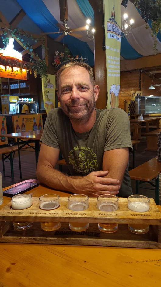 Bevor wir weitergefahren sind, haben wir uns entschieden, zwar keine Brauereibesichtigungstour zu machen, aber dem Bierzelt einen Besuch abzustatten. Wir waren nicht wenig erstaunt, als wir die große deutsche Überschrift „Biergarten“ und den Zelthimmel in bayerischem Blau-Weiß erblickt haben. Alles sah aus, wie zu Hause in Deutschland. Auf der Menükarte gab es nicht nur Bier wie „Pilsner“ und „Yaktoberfest“ sondern sogar „Schnitzel“. Da wir nachher fahren mussten, haben wir nur einen „Beerflight“ genommen, der 5 verschiedene Bierproben enthielt. Marc fand sie zwar nur mäßig gut, aber die Atmosphäre war toll. Marius hat auch ein Schnitzel bestellt. Es war aus Hähnchen, aber schmeckte ganz gut. Wir haben auch ein paar Brezen mitgenommen. Die sahen zwar nicht nach Laugengebäck aus, aber egal, wir werden sie zum Frühstück essen.
