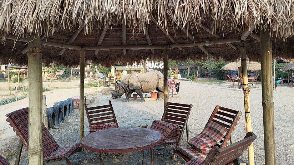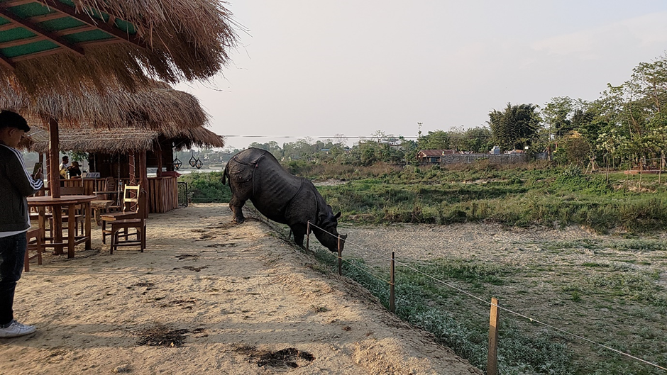 Der Ausblick war herrlich, ich habe auf die Boote auf dem Fluss und den zum Nationalpark gehörenden Wald auf der anderen Seite beobachten können. Es war richtig schön und entspannend, da zu sitzen und die Ruhe zu genießen. Es gab noch nicht viele Gäste, außer mir nur 3-4 andere Leute. Irgendwann habe ich gehört, wie ein Kellner hinter mir einem Gast sagte, dass er lieber zu ihm rüberlaufen soll und nicht dort Platz nehmen sollte, wo er ursprünglich sich hinsetzen sollte. Ich habe von meinem Buch aufgeschaut, um die Situation zu beobachten und plötzlich sah ich hinter mir, nur ein paar Meter von mir entfernt, ein riesengroßes Nashorn über das Restaurantgelände zu laufen! Es hat in Seelenruhe den Platz zwischen Stühlen und Tischen durchquert und wollte auf der anderen Seite einen Hang runterlaufen, um zum frischen, grünen Gras zu kommen. Alle Gäste von unserem und allen nahe gelegenen Restaurants sind ihm – einen respektvollen Abstand haltend – gefolgt. Es hat nach mehreren Versuchen es geschafft, die abgrenzenden Seile zu zerreißen und hat in der Senke angefangen, seinen gut verdientes Gras zu naschen. Ich bin ganz schnell zu Fritzchen gerannt, um die anderen zu holen. Sie wollten mir kaum glauben, aber sind schnell mit mir zurück und konnten das schöne Tier auch selber beobachten.