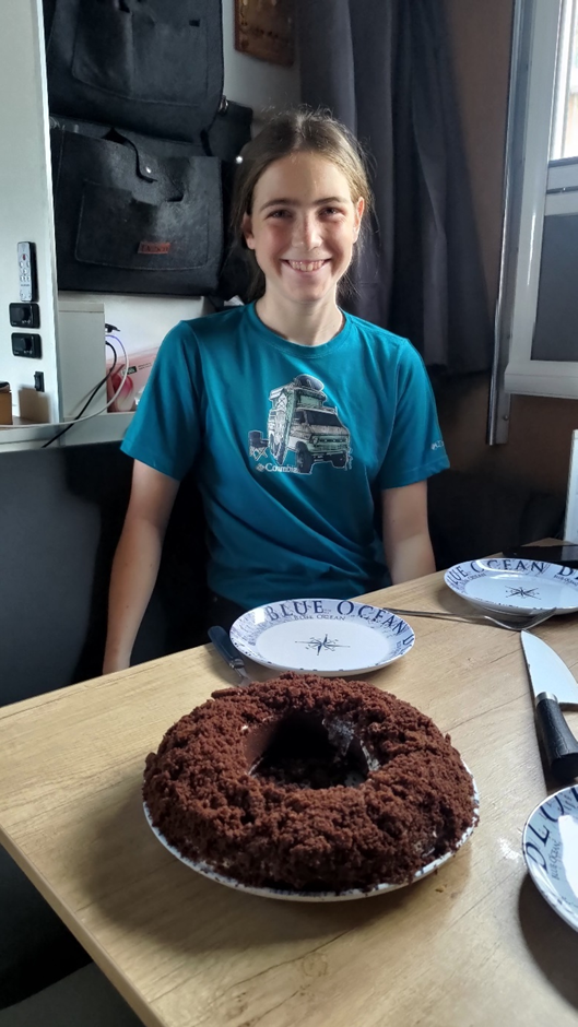 Miras Maulwurfkuchen wurde dann fertig. Wir wollten ihn aber heute noch nicht aufschneiden, sondern morgen zum Frühstück essen.