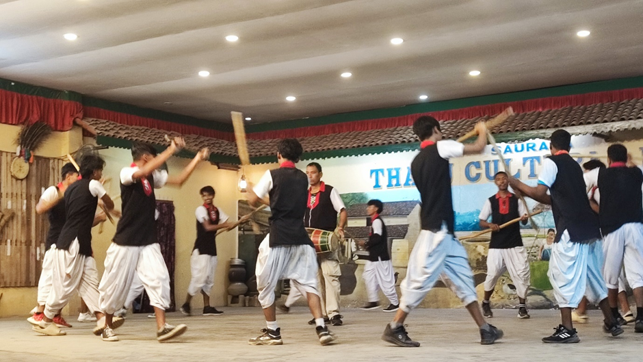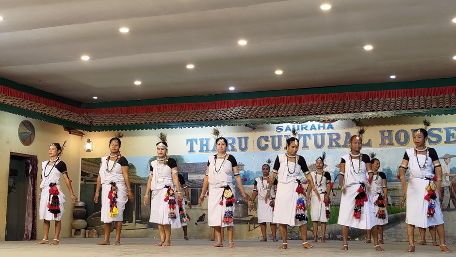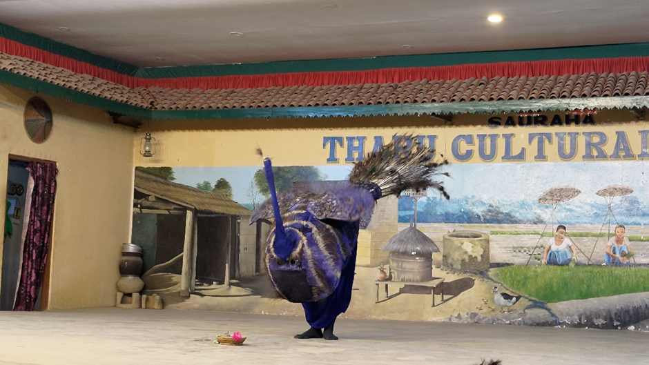 Um dreiviertel sieben haben wir uns mit dem Mann von der Touristenagentur getroffen und er hat uns zum Gemeindezentrum der Tharu begleitet. Die Tharu sind eine indigene ethnische Gruppe im flacheren Süden vom Nepal und Norden von Indien, der Terai heißt. Sie sind in Nepal als ein eigen Volk anerkannt. Sie haben ihre eigene Kultur, die sie versuchen, zu bewahren. Die Culture Show, die wir besucht haben, bestand hauptsächlich aus verschieden Tänzen, die bei verschiedenen Anlässen (wie Ernte, Krieg oder Todesfall) vorgeführt werden. Die tanzenden Männer und Frauen trugen ihre lokale Tracht und Instrumente. Uns hat insbesondere der Pfautanz und der Kriegstanz der Männer sehr gut gefallen. Nach der Show sind wir zu Fritzchen zurückgelaufen und haben am Flussufer im Sunset View Restaurant zu Abend gegessen. Irgendwann kamen aber zu viele Moskitos und wir haben uns in Fritzchen zurückgezogen.