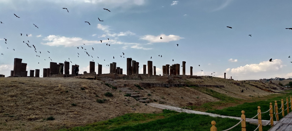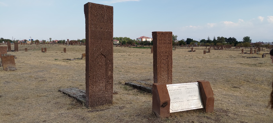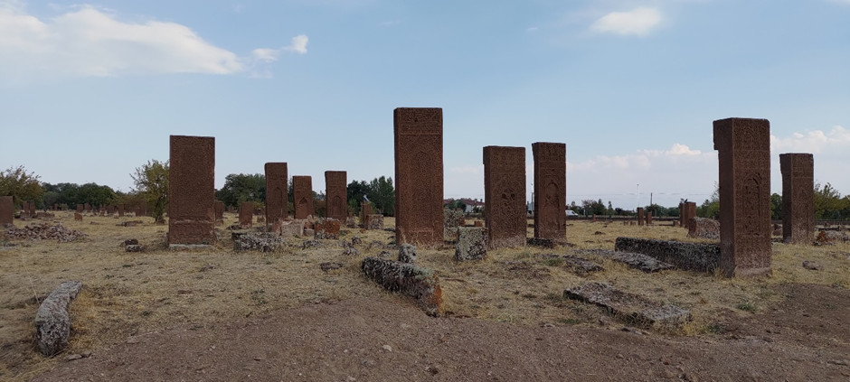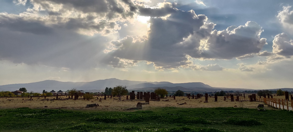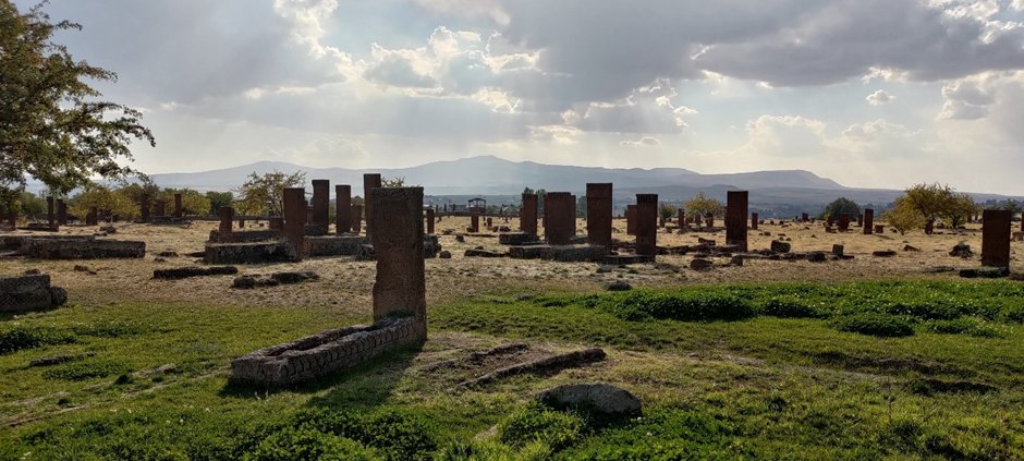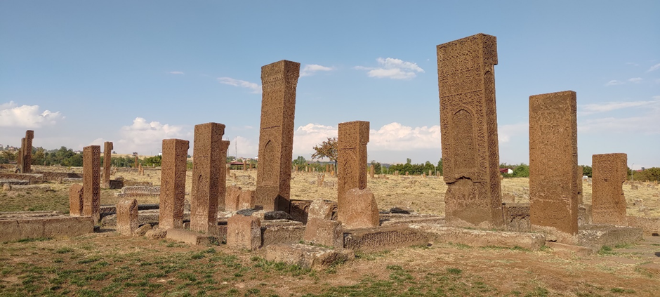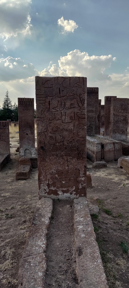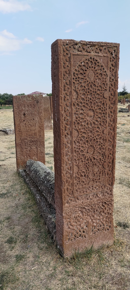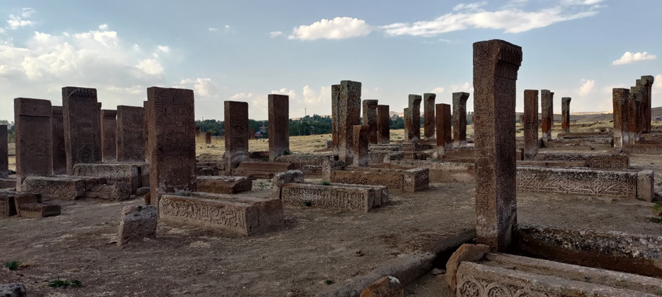 Wir haben noch ewig viel Zeit damit verbracht, aufzuräumen, unsere Wäsche wieder einzusammeln, Bettwäsche wieder anziehen und Wasser zu tanken. Als wir losfuhren, war es schon Nachmittag um ca. 2 Uhr. Wir haben auch noch eingekauft. Danach war unser Ziel Ahlat, wo wir den größten historischen (seljukischen) Friedhof der Türkei (gleichzeitig der drittgrößte in der Welt) besuchen wollten. Ahlat war (zusammen mit Belh in Afghanistan und Bukhara in Uzbekistan) eine von den drei wichtigsten wissenschaftlichen Städten und Kunst- Zentrum der islamischen Welt im 13. Jahrhundert. Der Friedhof bedeckt eine Fläche von 210.000 m2 und hat ca. 9.000 Grabsteine, die aus den 12.-16. Jahrhundert stammen.