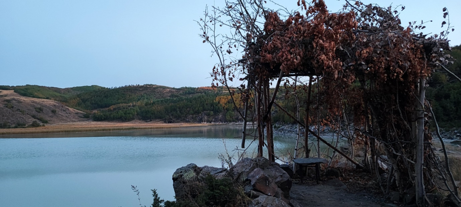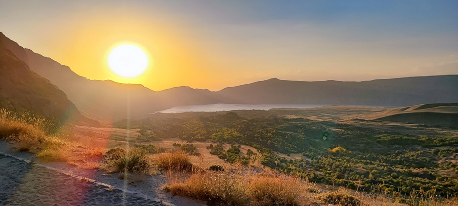Aber jetzt war Zeit, zum Kratersee zu fahren. Der Nemrut Vulkan (nicht zu verwechseln mit dem Nemrut Dagi in der Nähe von Sanliurfa, wo die großen Skulpturen von den Kommagenen waren) ist mehr als 3000 m hoch. Wir haben den Weg schnell gefunden, jetzt mussten wir nur die mehr als 1000 Höhenmeter überwinden. Der Ausblick auf den Van-See und Tatvan war atemberaubend, wir fühlten uns wieder wie Adler. Bis zur Skiliftstation (es war ein Sessellift, im Moment außer Betrieb) führe eine asphaltierte Straße. Danach gab es teilweise eine Schotterstraße, teilweise Kopfsteinpflaster. Als die Straße hinter den Kraterrand bog, hat das Bild, das sich uns öffnete, uns alle sprachlos gemacht. Wir blickten in ein riesigen Vulkankrater mit einem Vulkansee und eine wunderbare Landschaft herunter. Die verstreut sichtbaren Bäume hatten schon ein Herbstkleid an. Es war wirklich magisch, als wir immer mehr in das Innere des Kraters reinfuhren.
