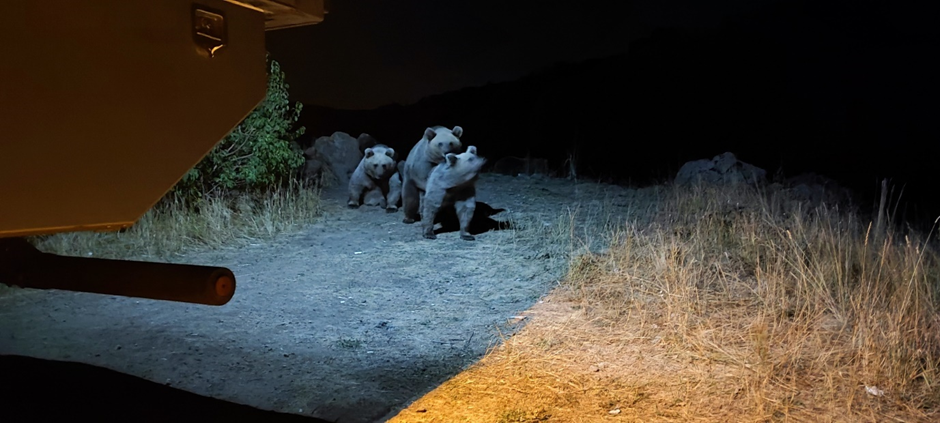 Die Jungs und Mira haben angefangen, das Fleisch zu grillen. Ich war mit Ilona in ihrem Van und Marius stand in der offenen Tür des Vans, als er plötzlich rief: „Mama, hier ist ein Bär!“. Ich habe erstmal gedacht, er macht nur Scherze, um uns zu erschrecken, aber als ich neben ihm rausschaute, habe ich hinter ihm in ca. 1 m Entfernung tatsächlich einen großgewachsenen Braunbären erblickt. Wir haben ganz schnell die Vantür zugemacht und mit lauten Rufen die anderen bei Fritzchen gewarnt. Kurz darauf lief der Bär weiter und der Mann von der Teebude neben uns kam. Er hat gesagt, dass der Bär uns nichts tun würde und die Abends hier immer vorbeilaufen. Wir sind trotzdem zu Fritzchen hochgelaufen. Die Jungs haben dort ein paar andere Bären gesehen, die aber nicht näher kamen. Wir standen noch alle draußen und die Jungs haben noch das Fleisch und die Würstchen fertiggegrillt, als wieder vier Bären kamen. Diese haben sich ca. 5 m entfernt von uns hingelegt und uns beobachtet. Und wir sie. Es war unglaublich, riesige Braunbären aus solcher Nähe zu sehen, wir konnten uns sowas bisher nicht einmal vorstellen.