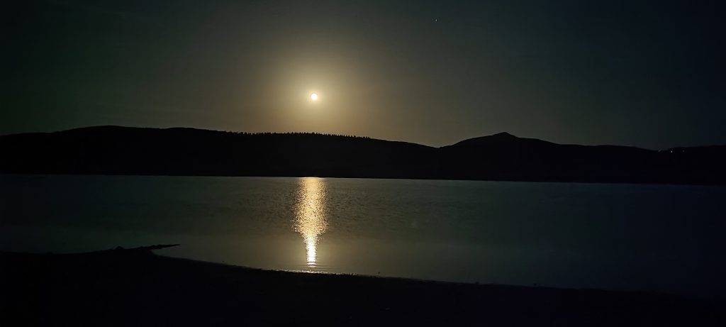 Vor dem ins Bett gehen bewundern wir noch den Vollmond, der direkt über dem See aufgeht und die Landschaft wunderschön beleuchtet. Außer einem Schäfer und seinen Schafe kommt bei uns während der Nacht keiner vorbei und wir verbringen eine sehr ruhigen Nacht in schöner, kühler Luft.