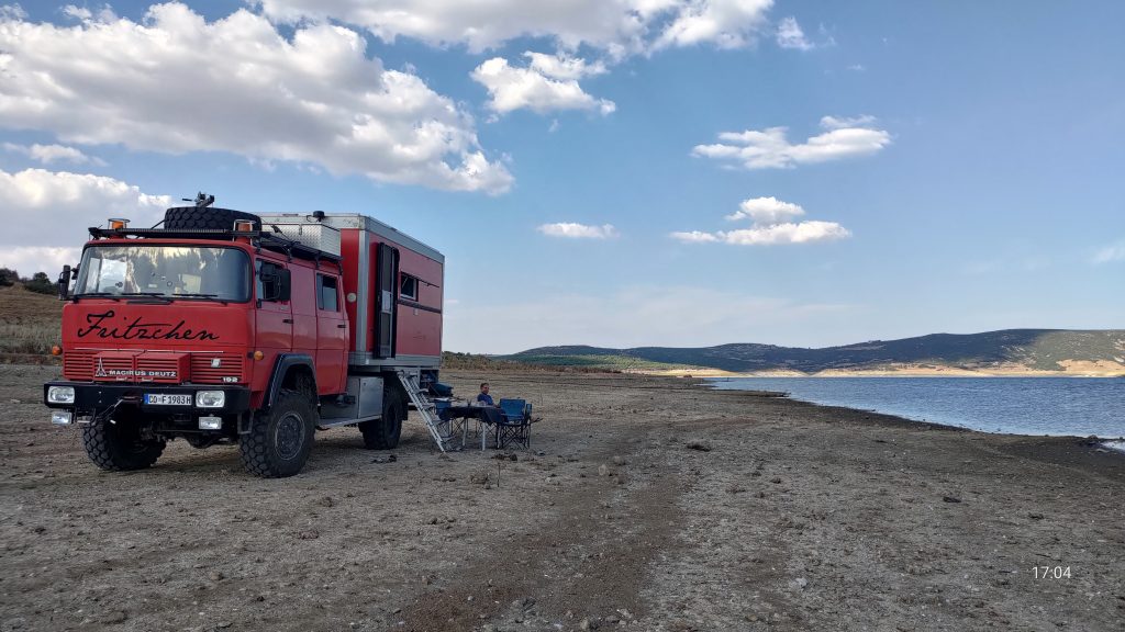 Wir haben uns für unsere heutige Nacht einen Schlafplatz an einem See ausgesucht. Wir kommen zu den Koordinaten, aber wo ist der See??? Tatsächlich ist der See auf die Hälfte geschrumpft. Es handelt sich um einen Stausee, und wir sind am Ende des Sommers. Offensichtlich wurde das Wasser des Sees für die Landwirtschaft oder zum Trinken verbraucht.