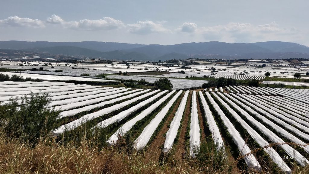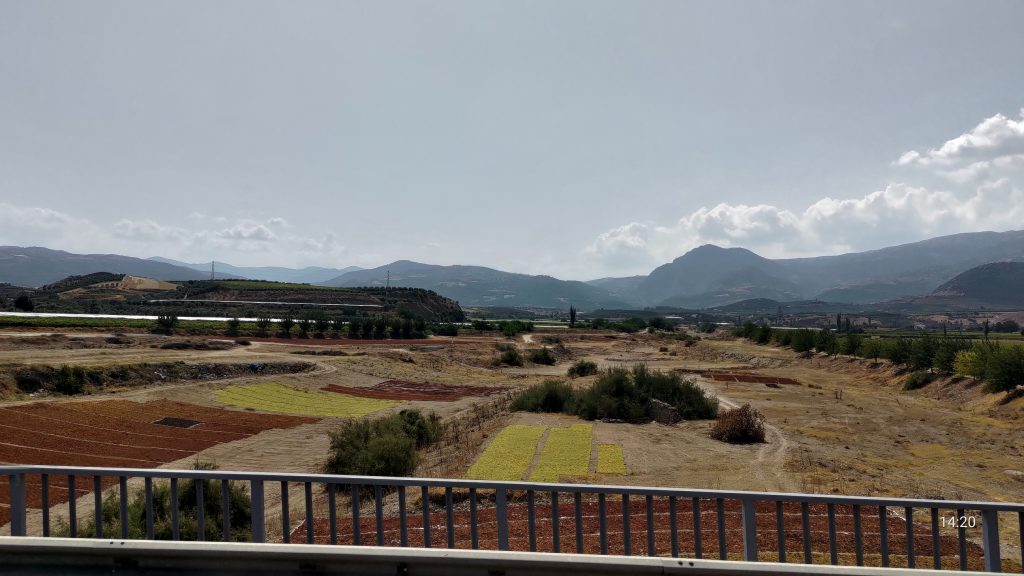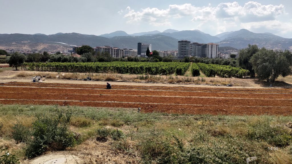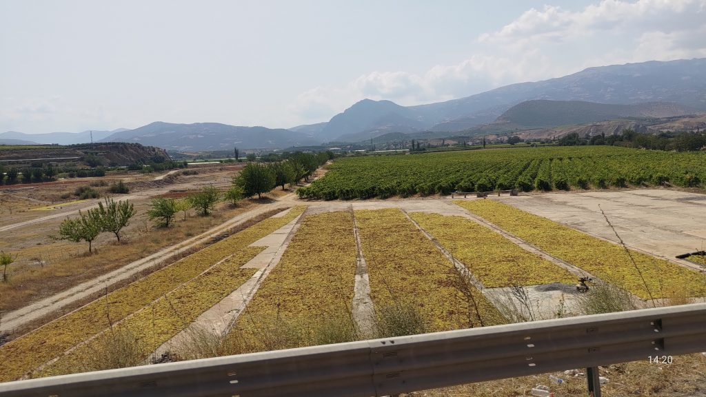 Wir fuhren durch hügelige Landschaften mit unglaublich viele Trauben-Plantagen. Wir haben noch nie so viele Trauben, vor allem in flachen Stellen (nicht auf Berghängen) gesehen. Da hier wenig Wein getrunken wird, werden die Trauben zum Großteil zu Rosinen.  Dies sehen wir tatsächlich auf dem Weg; überall sind zwischen den Traubenfeldern große schwarze Planen, worauf die Trauben (erst grün, dann bräunlich, am Ende dunkelbraun) in der Sonne zum Dörren ausgelegt sind.