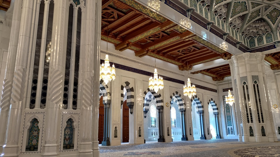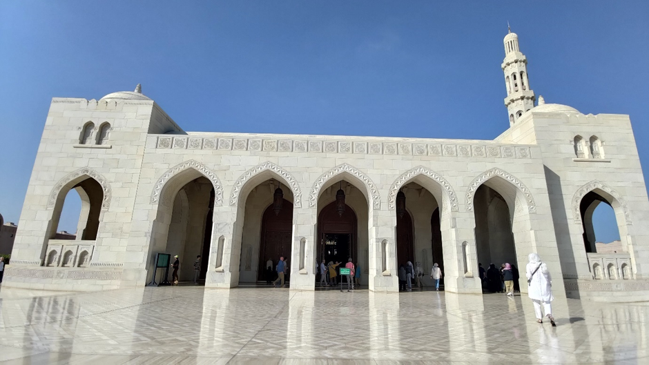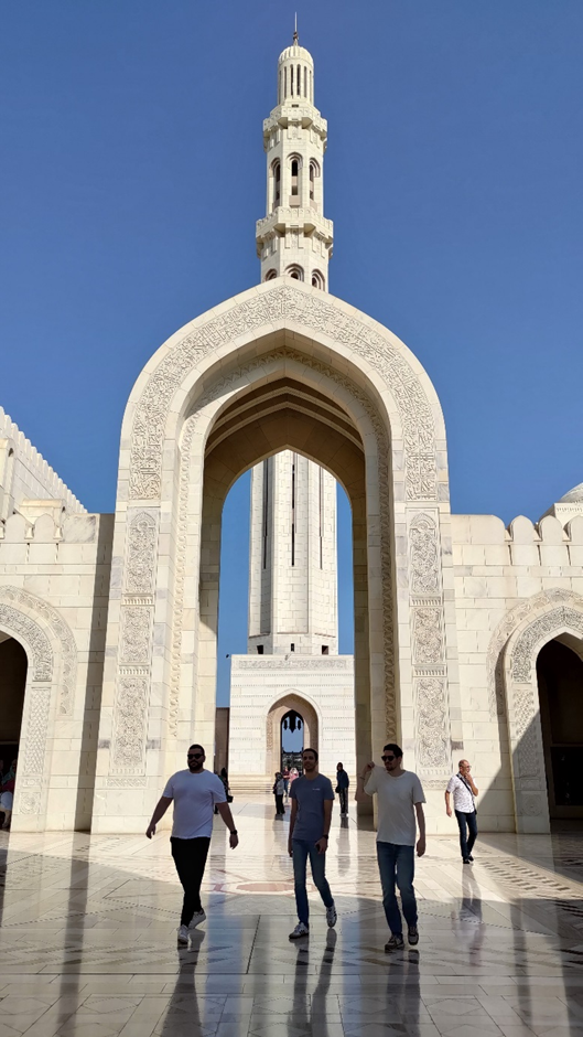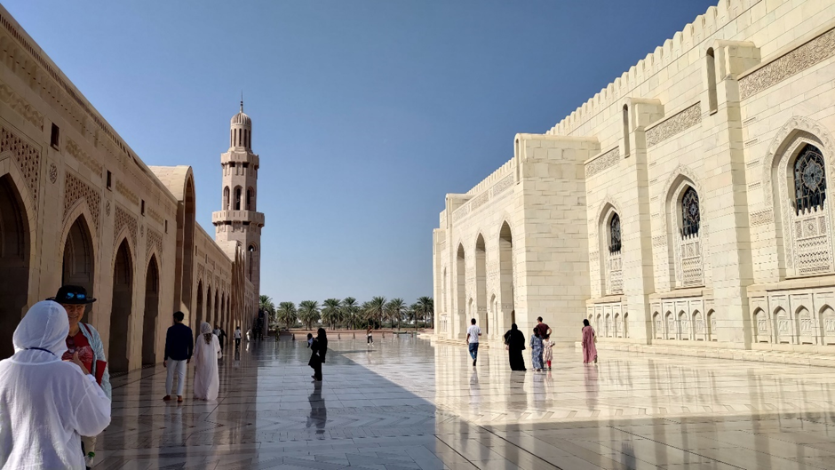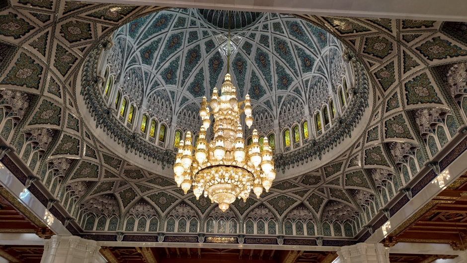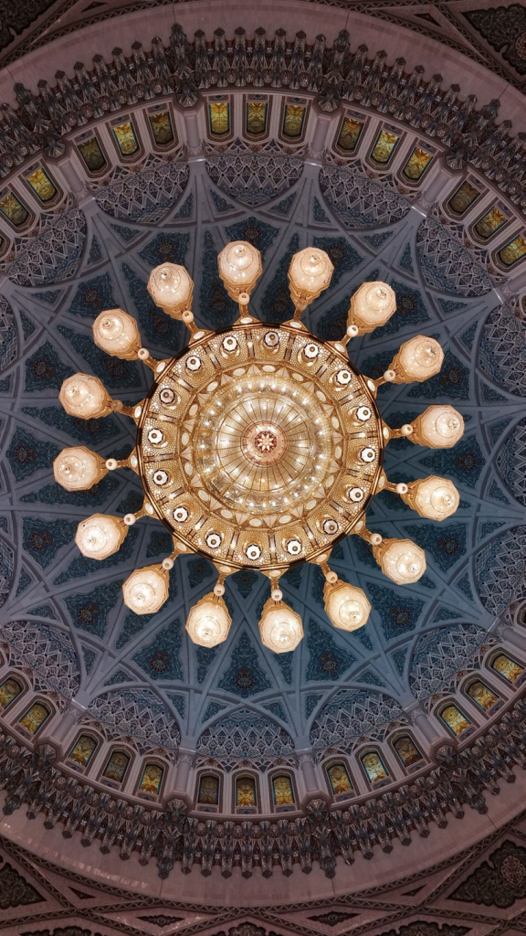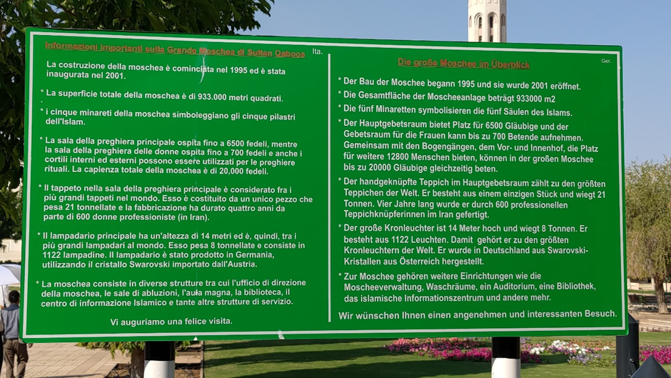 Unser erstes Ziel war (endlich) die Sultan Qaboos Grand Mosque. Die Moschee hat Sultan Qaboos zur Feier seiner 30 jährigen Regierung der Nation geschenkt. Sultan Qaboos wird fast wie ein Nationalheld im Oman geliebt und geehrt. Er war derjenige, der das Land aus fast feudalischen Verhältnissen in ein modernes Industrieland umwandelte. Als er 1970 auf den Thron kam, gab es nur 10 km asphaltierte Straße, nur 2 Krankenhäuser und keine höheren Schulen. Es gelang ihm mit weisen Entscheidungen, guter Regierung und einer enormen Investition in das Schulsystem und Bildung, einen modernen und friedlichen Oman aufzubauen, der gleichzeitig seine Traditionen bewahrte. Er starb 2020, aber er ist bis heute allgegenwärtig im Oman.