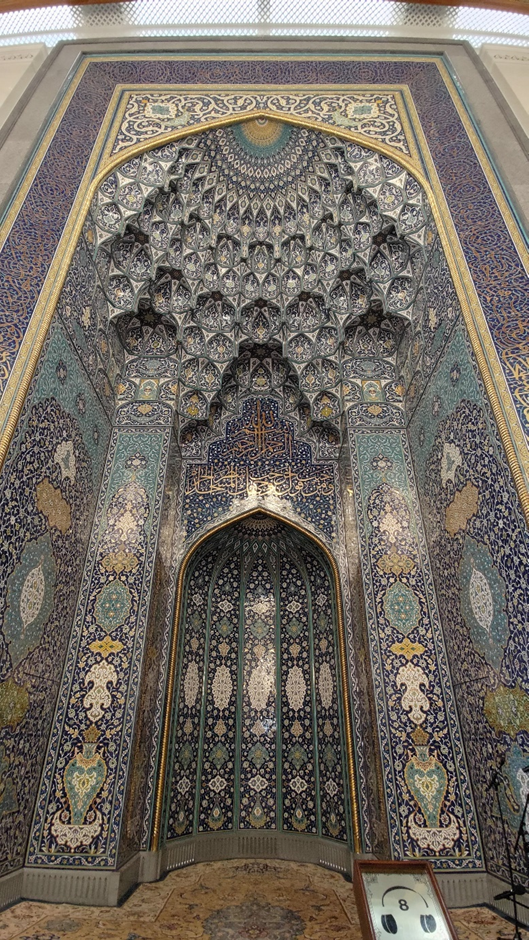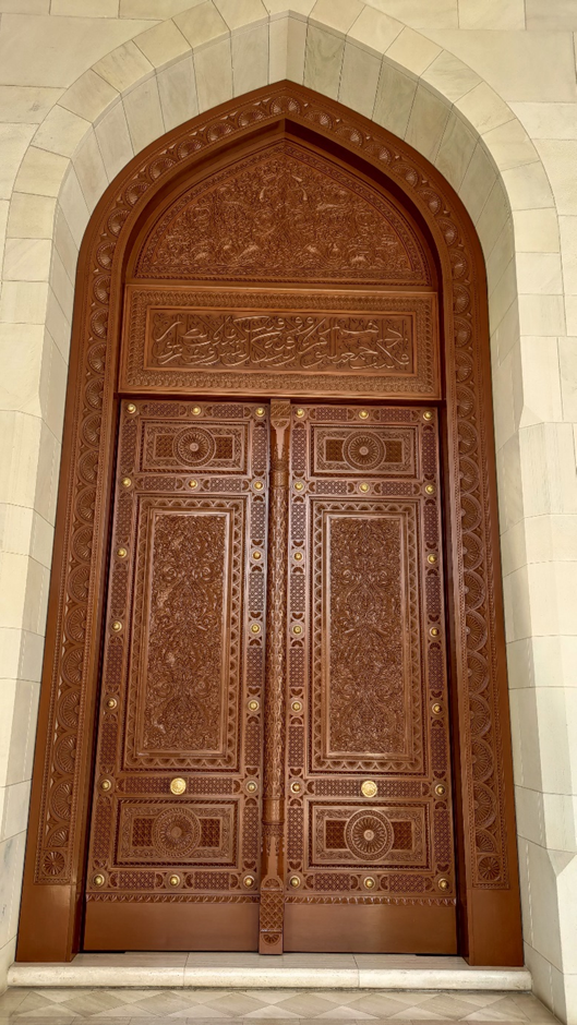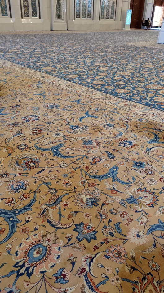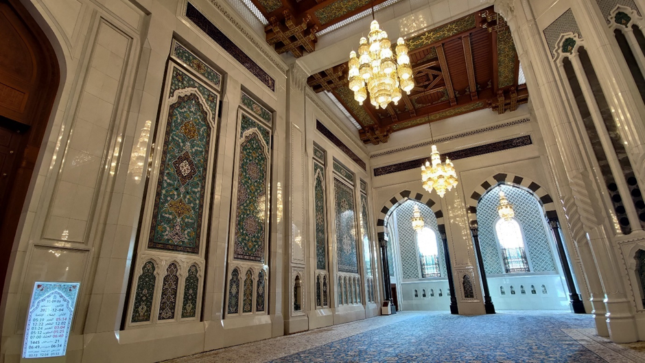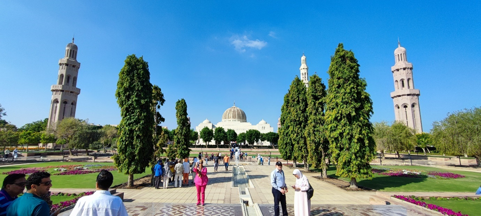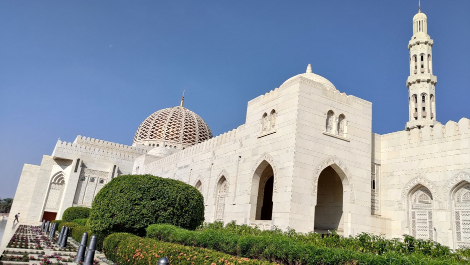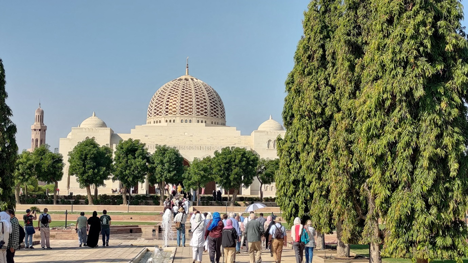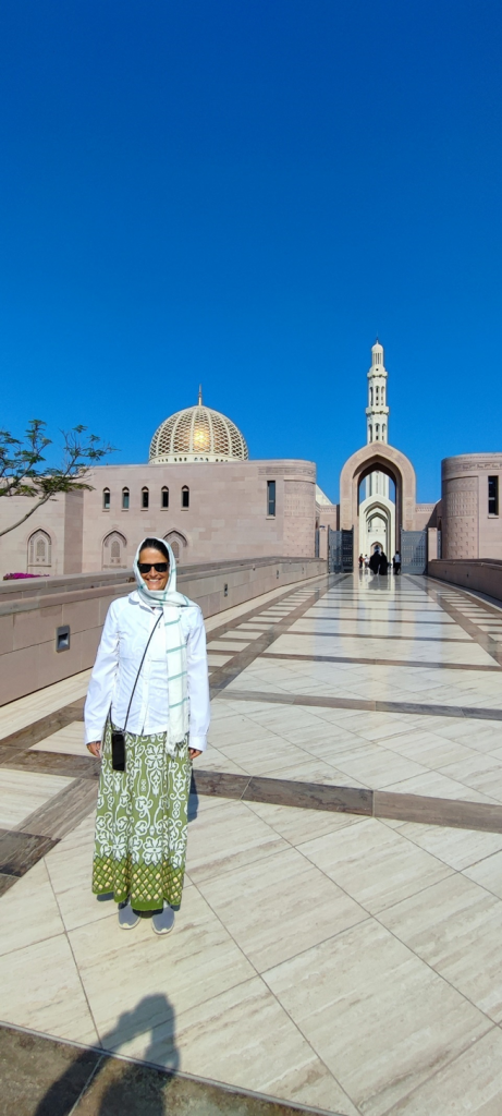 Unser erstes Ziel war (endlich) die Sultan Qaboos Grand Mosque. Die Moschee hat Sultan Qaboos zur Feier seiner 30 jährigen Regierung der Nation geschenkt. Sultan Qaboos wird fast wie ein Nationalheld im Oman geliebt und geehrt. Er war derjenige, der das Land aus fast feudalischen Verhältnissen in ein modernes Industrieland umwandelte. Als er 1970 auf den Thron kam, gab es nur 10 km asphaltierte Straße, nur 2 Krankenhäuser und keine höheren Schulen. Es gelang ihm mit weisen Entscheidungen, guter Regierung und einer enormen Investition in das Schulsystem und Bildung, einen modernen und friedlichen Oman aufzubauen, der gleichzeitig seine Traditionen bewahrte. Er starb 2020, aber er ist bis heute allgegenwärtig im Oman.