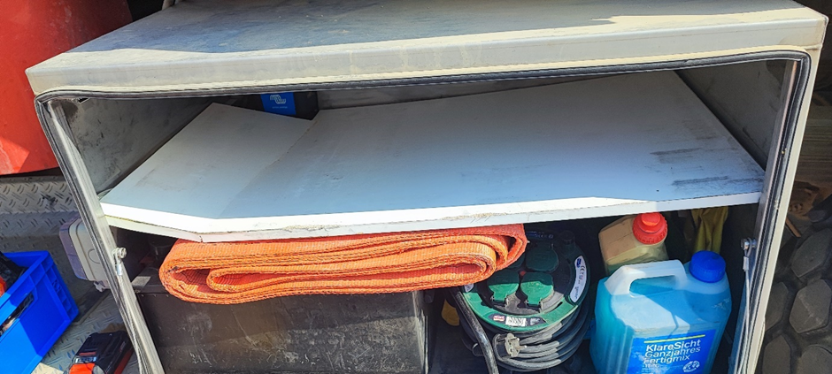Wir hatten noch eine Aufgabe zu erfüllen. In einer unserer Außenmetallkisten ist eins von den Regalen gebrochen. Es war aus gepresstem Holz und war unseren Offroad-Strecken nicht gewachsen. Finn hat uns eine Adresse von einem Heimwerkerladen gegeben (hier gibt es nicht viele solche große Heimwerkerläden, wie bei uns OBI oder Toom.) Als wir da ankamen, kam ein Mitarbeiter gleich auf uns zu. Wir haben ihm unser Problem erklärt, worauf er uns zum Lager von großen Holzplatten im Hof geführt hat. Sie hatten verschiedene Holzplatten im Angebot, wir haben schnell eine härtere für uns gefunden. Sie konnten die Platte für uns auch schneiden. Es war perfekt!
