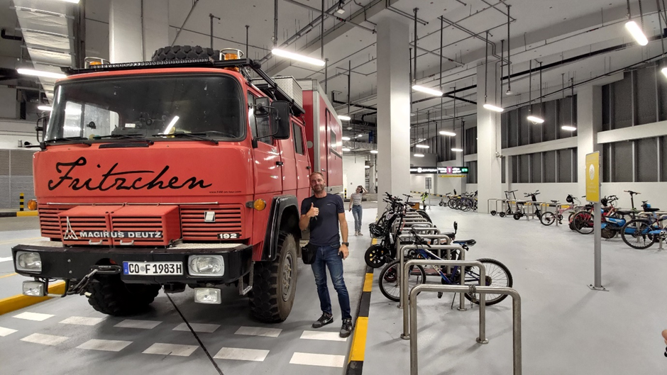Nach viel Arbeit kam die Belohnung. Mira wollte ins Kino, um dort den neuen Film „Die Tribute von Panem – The Ballad of Songbrids & Snakes“ anzuschauen. Sie hat im Internet nachgeschaut, dass es in der Mall of Oman um 19:45 Uhr eine Vorstellung auf Englisch geben sollte. Wir sind da hingefahren, aber da waren nur überdachte Außenparkplätze, wo wir mit Fritzchen natürlich nicht hineinpassten. Es gab noch ein Parkhaus, aber gewöhnlicherweise passen wir in Parkhäuser noch weniger rein. Aber links gab es noch eine Spur, die mit Busse und Ladeverkehr gekennzeichnet war. Und es gab tatsächlich Busparkplätze in der untersten Etage des Parkhauses, die 4,50 m Höhe hatten! Das war das erste Mal, dass wir in einem Parkhaus geparkt haben!