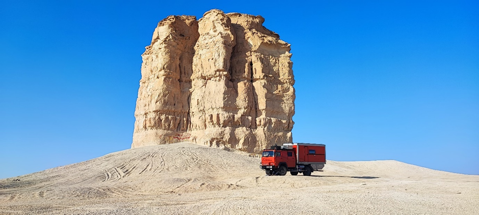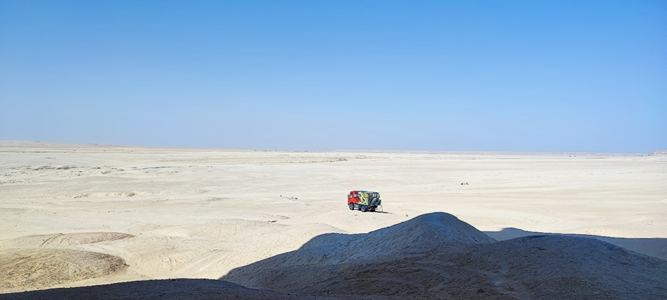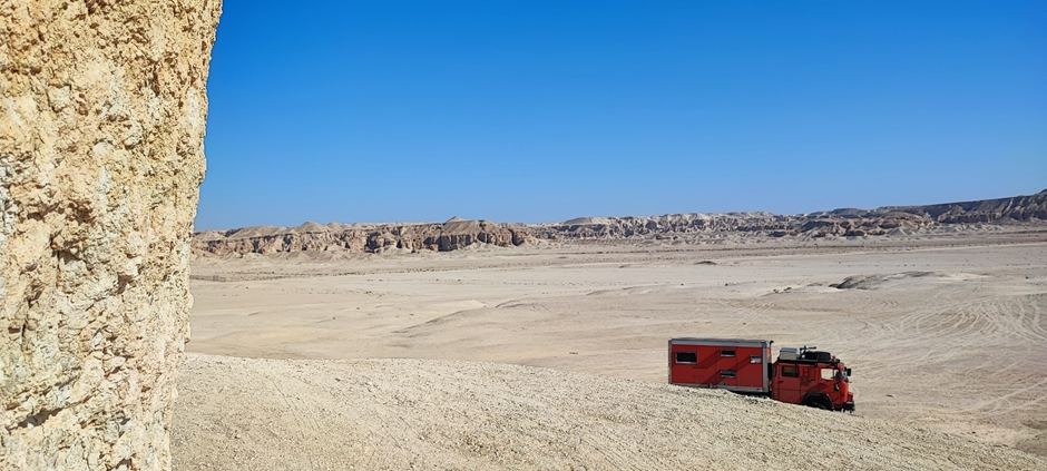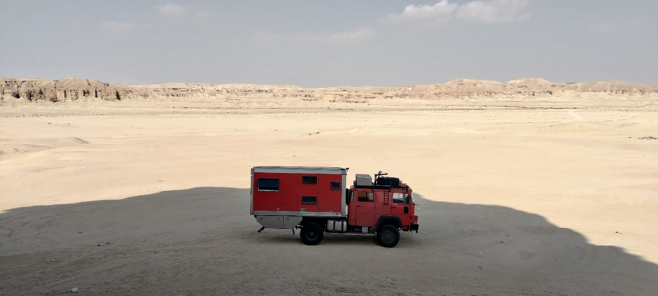 Währenddessen haben Mira und ich in Fritzchen Karten gespielt, Marius hat online mit seinen Freunden gezockt. Plötzlich hat Mira sich annähernde Lichter entdeckt. Wir haben sofort geschaut, was für einen Fahrzeug kommt und schnell gesehen, dass es ein großer Lkw ist. Als sie näher kamen, war es auch klar, dass es auch ein Overlander Fahrzeug ist. Mira und ich sind ausgestiegen und zu ihnen gelaufen. So haben wir Steffi und Thomas aus Österreich kennengelernt. Ich habe ihnen erzählt, was uns gerade passierte und Marc dabei ist den Anlasser reparieren/austauschen zu lassen. Sie haben darauf geantwortet: „Der Anlasser? Wir haben einen Ersatzanlasser dabei. Weil uns genau das Gleiche zu Hause noch in Österreich passierte. Er ging plötzlich nicht, ohne Vorwarnung.“ Kaum haben wir 5 Minuten uns unterhalten, kam wieder ein Fahrzeug. Es war Marc mit Abdullah. Wir haben uns bei Abdullah tausendmal bedankt für seine unglaubliche Warmherzigkeit und Hilfebereitschaft. Danach ist er mit seinem schlafenden Sohn auf der Rückbank zurück nach Dammam gefahren. Wir haben uns noch mit Steffi und Thomas unterhalten, bevor wir uns alle schlafen gelegt haben. Was für ein Tag!