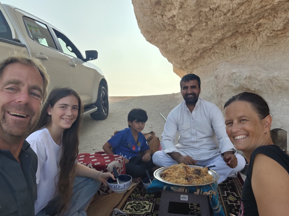 Direkt am Fels parkte ein weißer Pickup, daneben lagen auf einem Teppich Vater und Sohn. Wir haben sie mit Salam Aleikum begrüßt. Sie waren sehr freundlich, der Vater konnte ein bisschen Englisch. Er hat uns zu ihrem Mittagessen eingeladen, das er gerade vorbereiten wollte: Kamelfleisch mit Reis. Wir wollten Champignoncremesuppe machen. Wir sind so verblieben, wir bereiten beide das Essen vor, danach teilen wir und essen gemeinsam. Als wir zu Fritzchen zurückgelaufen sind, wollten wir ihn umparken, weil er noch schief stand. Aber wir konnten den Motor nicht starten. Es war sofort klar, dass das Problem mit der Elektrik zusammenhängt. Am Anfang haben wir gehofft, dass nur eine Kabelverbindung sich gelöst hat. Leider wurde unsere Hoffnung nicht wahr. Nach weiterer Untersuchung hat Marc festgestellt, dass der Anlasser kaputt ist. Bevor er ihn ausgebaut hat, haben wir erstmal das gemeinsame Mittagessen mit Abdullah und seinem 7-jährigen Sohn genossen.