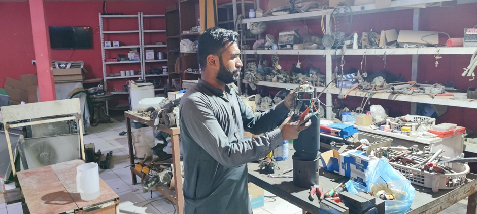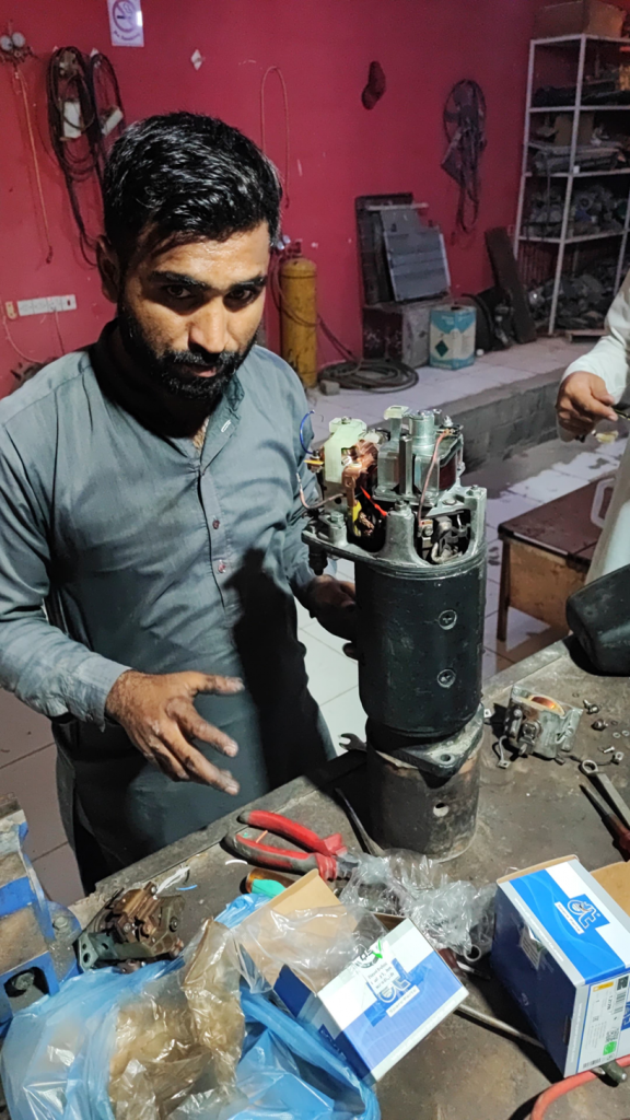 Sie sind von der Wüste rausgefahren bis zum ersten Kreisverkehr bei Urayarah. Hier hat Abdullah gefragt: „Dammam or try here?“ Marc hat natürlich geantwortet „Try here“. Also sie sind in die nächsten Ortschaft gefahren. Abdullah hat telefoniert und sie haben relativ bald ein Autoelektriker gefunden. Er hat mit großem Können und sehr schnell den Anlasser auseinandergenommen und hat angefangen, ihn zu reparieren. Aber während seiner Arbeit hat er festgestellt, dass es mehr kaputt war, als er dachte und dass er ein fehlendes, wesentliches Ersatzteil nicht hat. Danach hat er Marc und Abdullah zu einem anderen Elektriker geschickt, der ausschließlich, seit 35 Jahren, nur Anlasser repariert. Er hat nach den Ersatzteil gesucht. Mit Bedauern hat er mitgeteilt, dass er den leider nicht hat, nur ein komplett neuen Anlasser aus Deutschland! Abdullah hat für uns den Preis verhandelt. Er hat beinhaltet, dass der Elektriker unseren alten Anlasser behalten darf. Dieser war noch bei dem ersten Elektriker. Als Marc und Abdullah ihn abgeholt und bei dem zweiten Elektriker abgeliefert haben, hat er gemerkt, dass der Lochmuster der Halterung und der Schwungrad des alten Anlassers anders ist, als die vom neuen. Er hat es noch schnell umgebaut (ohne Aufpreis) und dann waren sie fertig.