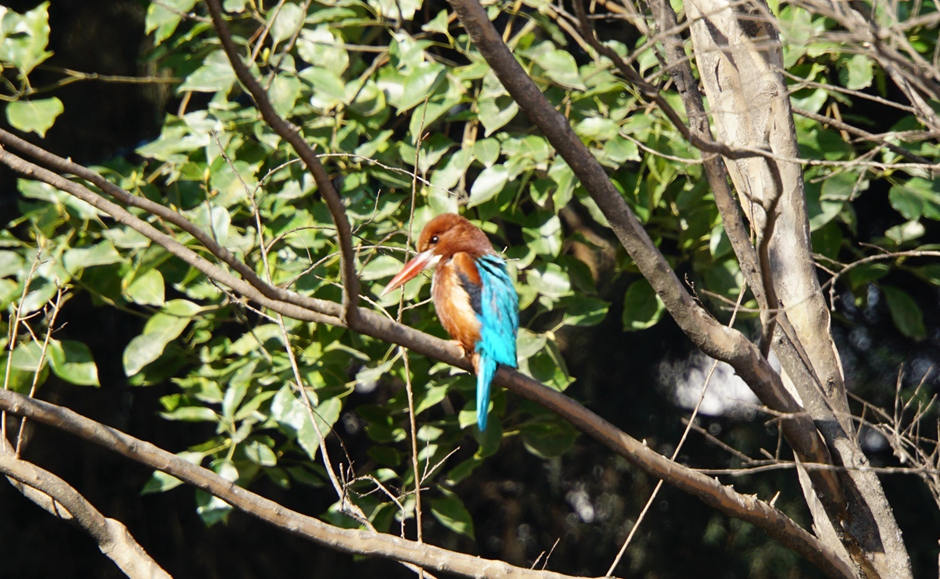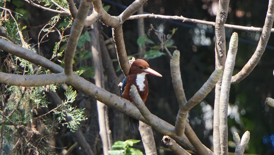 Hier, im Hof einer Werkstatt mitten in Kathmandu, mussten wir aber die Natur auch nicht vermissen, hier gibt es auch interessante Vögel (White throated kingfisher/Braunliest):