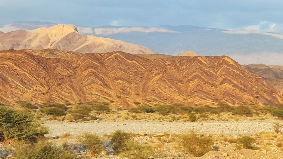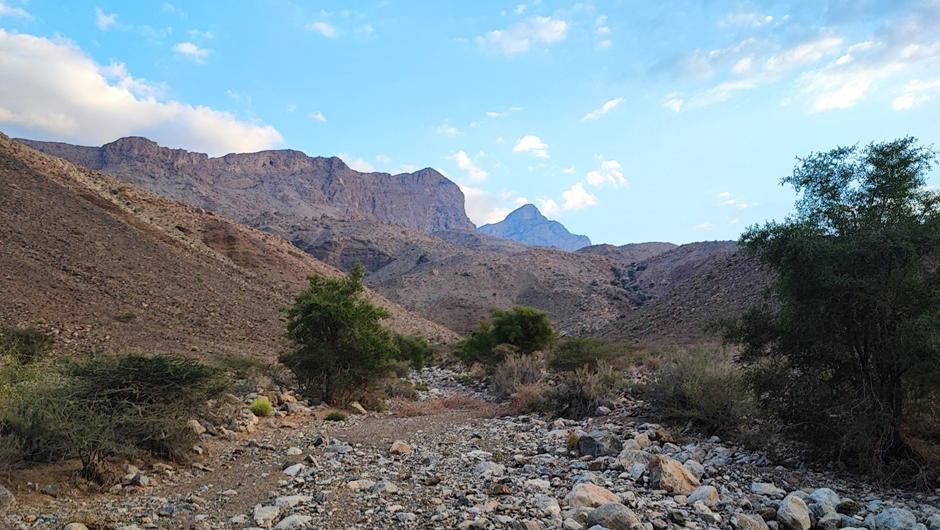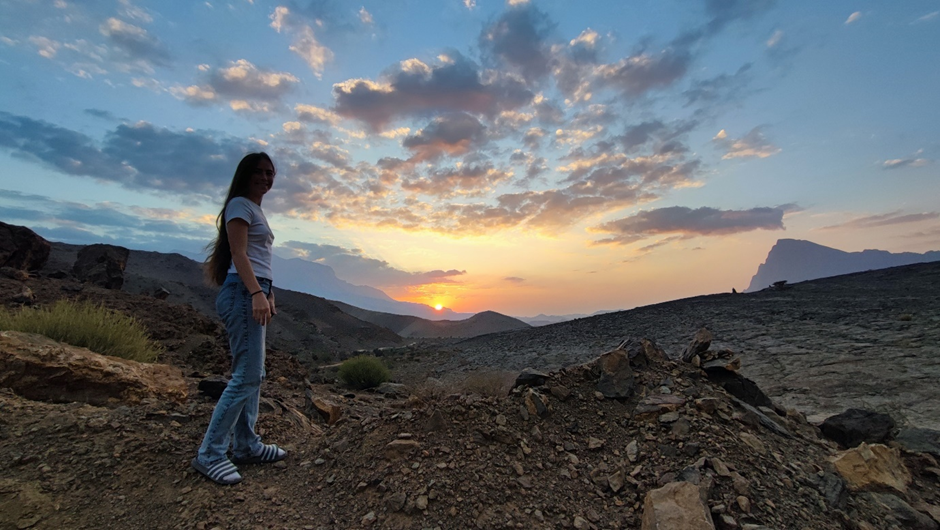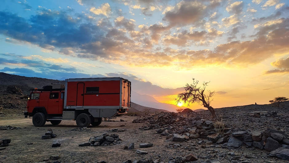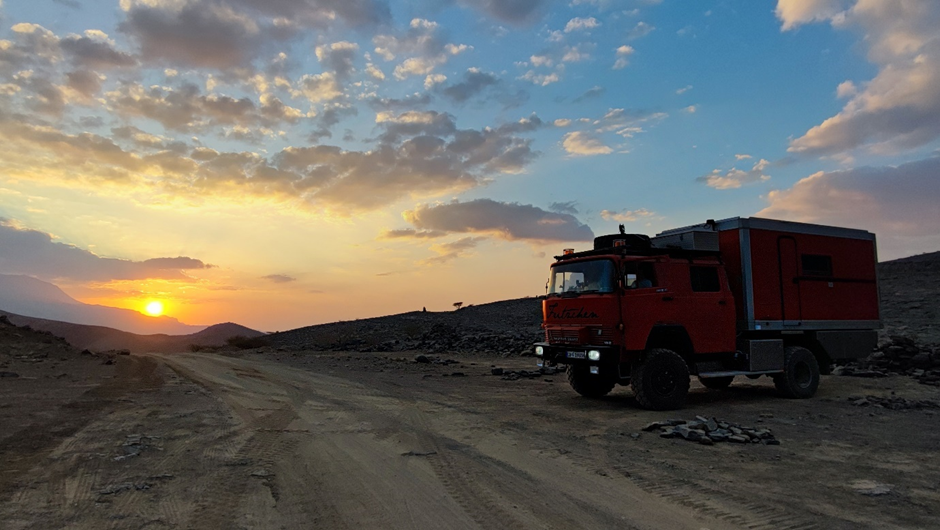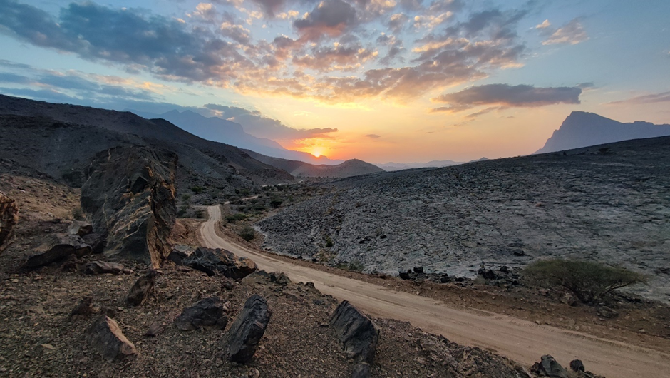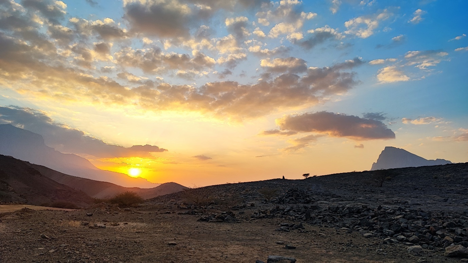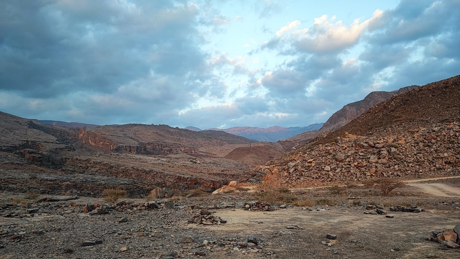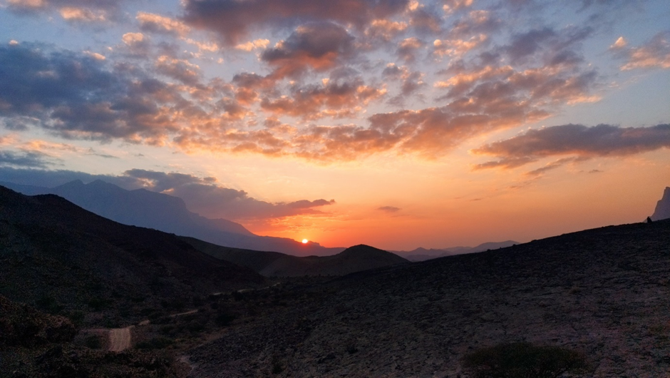 Wir sind dann weitergefahren zu Wadi Damm. Das war wieder mal eine Empfehlung von Éva. Dies sollte unser letztes Wadi in Oman sein. Wir haben die von Éva in ihrem Buch empfohlene Campingstelle angesteuert und sind wieder mal kurz vor Sonnenuntergang angekommen. Mit den letzten Sonnenstrahlen konnten wir noch eine wunderschöne Sicht auf die umliegende große Berge genießen.