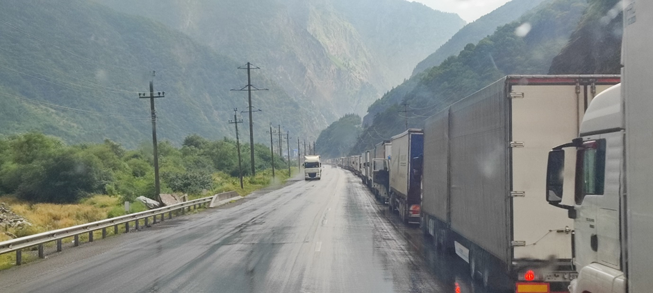 Als wir uns der Grenze näherten, hat es angefangen zu regnen. Die Straße wurde schmal. Vor der Grenze stand auf der rechten Spur eine lange Lkw-Schlange, woneben wir vorbeifuhren.