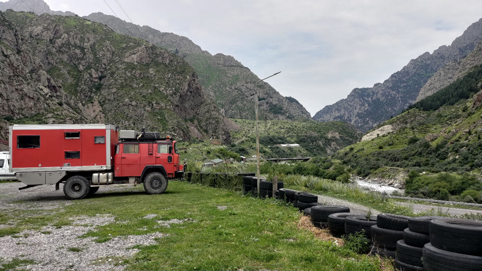 Die Spur hinter der linken Schranke führte zu den großen Toren, wo die Lkws abgefertigt waren. Auf der rechten Spur (auch hinter einer Schranke) standen nur Pkws. Wir wollten nach rechts, da wir rechtlich wie ein Pkw sind, wir sind privat unterwegs und betreiben keinen geschäftlichen Warenverkehr. Der junge Grenzbeamte hat das auch verstanden, wollte uns aber trotzdem nach links zu den Lkws schicken, weil wir zu groß seien. Wir fuhren dann links durch die Schranke und mussten nach 20 Metern bei dem nächsten Beamten wieder anhalten. Er schickte uns dann zurück und sagte, wir sollten zu den Pkws. Wir haben ihm mehrmals gesagt, dass wir fast 4 Meter hoch sind. Er hat es mehrmals beteuert, es sei kein Problem. Wir fuhren dann rückwärts durch die Schranke zurück und reihten uns bei den Pkws an. Zwischenzeitlich haben uns natürlich etliche Pkws überholt, aber egal. Wir standen dann hier in der Schlange und fuhren langsam in die Richtung eines Gebäudes, worunter wir durchfahren mussten. Die rechte Seite des Gebäudes stand auf dicken Säulen und die Straße führte darunter. Als wir dort ankamen, schauten wir beide hoch, aber über Fritzchen war mehr als ein halber Meter Raum. Alles gut. Als wir aber das andere Ende der „Unterführung“ errichten, bremste Marc richtig scharf. Vor uns, direkt über der Fahrerkabine war ein Balken zu sehen, der niedriger war, als die Decke. Erst hier haben wir gemerkt, dass wir unter dem Gebäude offensichtlich massiv aufwärts gefahren sind und unser Koffer fast jetzt schon die Decke berührte. Den Balken hätten wir mit Sicherheit mitgenommen. Marc ist vorsichtig nach vorne gefahren, um zu schauen ob es ggf. möglich wäre durchzufahren, wenn wir Luft ablassen würden und so niedriger wären. Aber was fehlte war viel zu viel, wir hatten keine Chance. Es gab keine andere Lösung, wir mussten zurück. Und natürlich alle Autos, die hinter uns standen auch. Die Freude unter den anderen Reisenden war natürlich groß. Aber sie hatten auch keine Wahl, sie mussten mitmachen. Also Rückwärtsgang rein und langsam, vorsichtig zurückfahren. Erstmal nur zu einer Seitenbucht, wo die anderen Autos vorbeifahren konnten, dann komplett zurück zur Schranke. Wieder raus und dann wieder bei den Lkws rein. Und nach ca. einer Stunde standen wir wieder bei den selben Beamten, der uns auf die andere Seite geschickt hat. Gut gemacht! Wir haben fast unser Dach und die Solarpanele wegen diesen Deppen demoliert. (Später haben wir ein Schweizer Ehepaar getroffen, die mit ihrem Lkw tatsächlich die Decke berührt haben. Zum Glück hatten sie keine größeren Schäden davon getragen.)