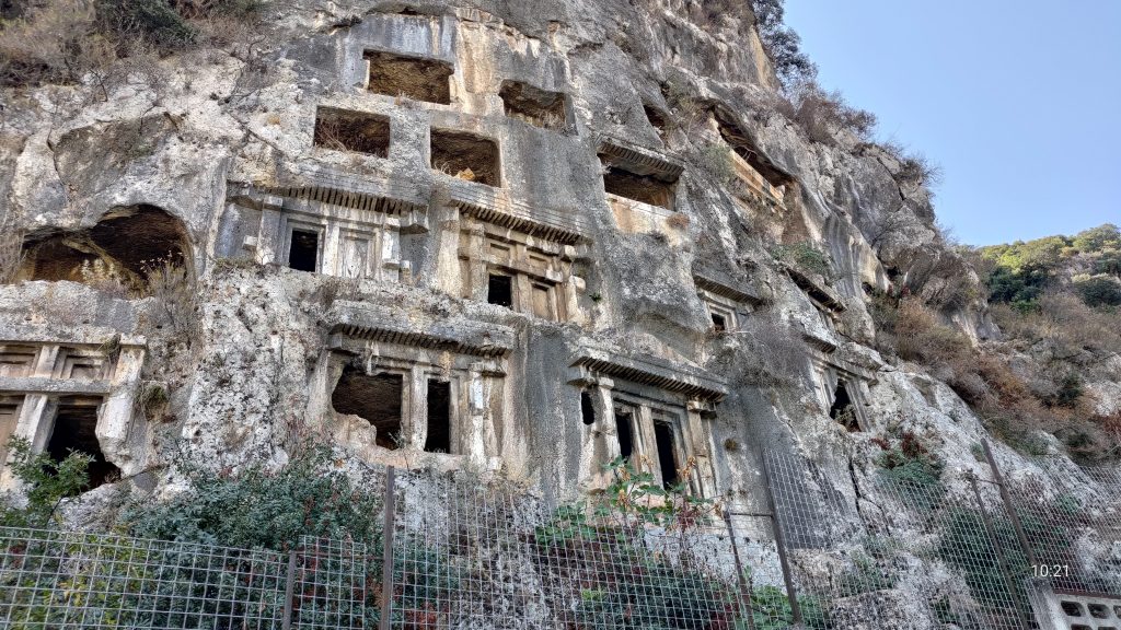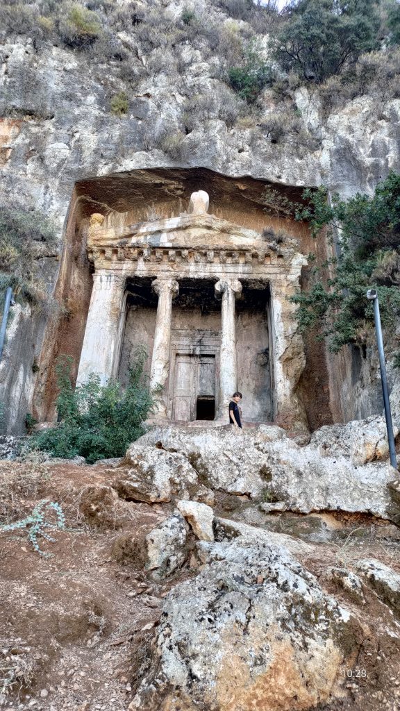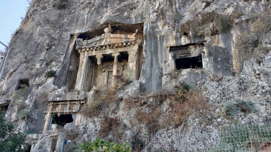 Wir hatten eine schönen Zeit am Inlice Strand, aber wir wollten weiter. Als Erstes sind wir zu den Felsengräbern von Fethiye gefahren. Das Größte von ihnen ist das Grab von Amyntas, dessen ionische Tempel-Fassade 350 vor Christus ins Fels gehauen worden war. Die Gräber gehören zu den Überbleibseln aus der lykischen Zeit der Gegend. Die Lykier waren ein Volk mit eigener Kultur, eigener Schrift und eigener Sprache, die Lykisch genannt wird. Die lykische Königreich erstreckte sich ungefähr von Dalyan bis Antalya. Es existierte mindestens ab dem 12. Jahrhundert vor Christus. Später, 168 v. Chr., haben die Lykier den Lykischen Bund, eine lose Konföderation von 23 unabhängigen Städten gegründet, die oft die erste protodemokratische Union der Geschichte genannt wird. Die gesamte Gegend ist gesäumt mit Ruinen dieser alten Zivilisation.