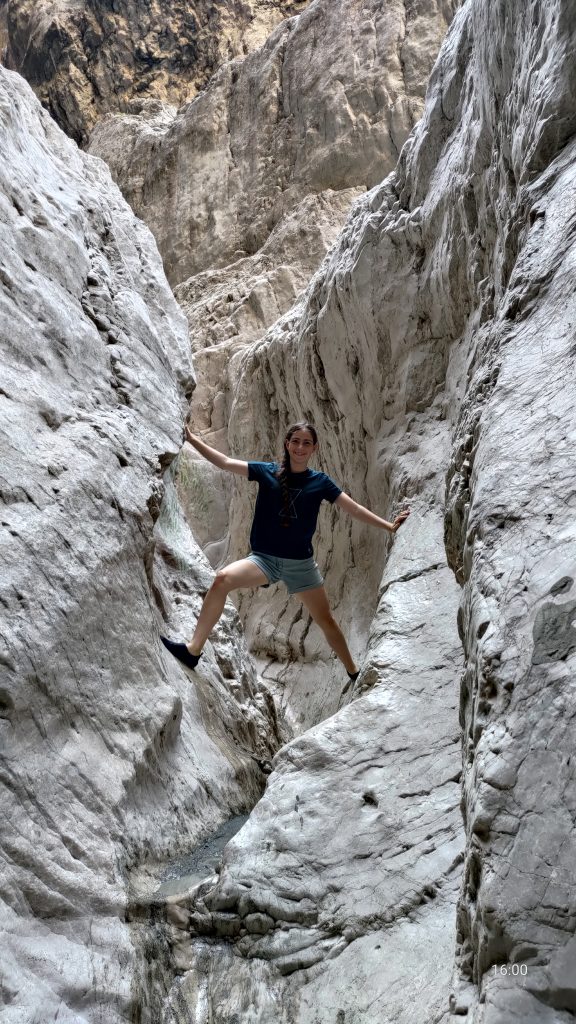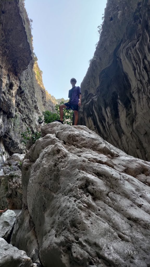 Wir sind immer weiter gelaufen, bis wir einen kleinen Pool gesehen haben, wo „Canyon-Guides“ saßen. Wir haben gedacht, sie werden uns nicht weiter reinlassen. Stattdessen haben sie uns erzählt, dass im Pool das Wasser bis zum Nacken reicht, aber man weiterkommen kann. Danach sei das Wasser wieder flach und nach ca. 800 m soll es einen Wasserfall geben. Der Guide kann uns den Weg zeigen und helfen. Wir haben nicht lange überlegt, unsere T-Shirts und Shorts ausgezogen und sind in Badeanzügen/Badehosen hinter dem Guide in den Pool gesprungen. Er hat jedem von uns geholfen, aus dem Pool zu kommen: wir mussten auf seinen Oberschenkel treten und uns an seiner Schulter festhalten. Danach war das Wasser tatsächlich wieder nur knöcheltief. Wir sind mit seiner Hilfe die ca. 800 m durch mal flachere mal tiefere Stellen gelaufen. Er hat uns immer wieder die richtigen Stellen gezeigt, wohin wir treten sollten oder mal eine Hand gereicht. Immer wieder hat er seinen Oberschenkel als Stufe oder seine Schulter als Halt bereitgestellt. Was wir gesehen und erlebt haben, war unglaublich. Links und rechts waren die Felswände kunstvoll geschwungen und bis zu 200 m hoch. Sie waren meistens schneeweiß und so nah zu einander, dass nicht mal der Sonnenschein seinen Weg nach unten findet. Unten rauschte die Bach, worin wir mal spazierten, mal kletterten. Und das alles nur für uns. Wir waren nämlich alleine. Vollkommen. 😊 Wir hatten alle nur ein Lächeln auf dem Gesicht und konnten es kaum glauben. Am Ende haben wir den Wasserfall erreicht. Sehr laut und mit sehr großer Kraft rauschte das Wasser hinter einem riesigen Felsbrocken zu Boden. Danach sind wir den Rückweg angetreten. Was wir die ganze Zeit überlegten ist, wie wir den Pool, wo wir am Anfang mit dem Guides Hilfe hochgeklettert sind, auf dem Rückweg überqueren könnten. Dann waren wir wieder da. Marius war als Erster dran. Und dann hat der Guide gesagt: „Jump“ (Spring). Da war dann alles klar. 😀