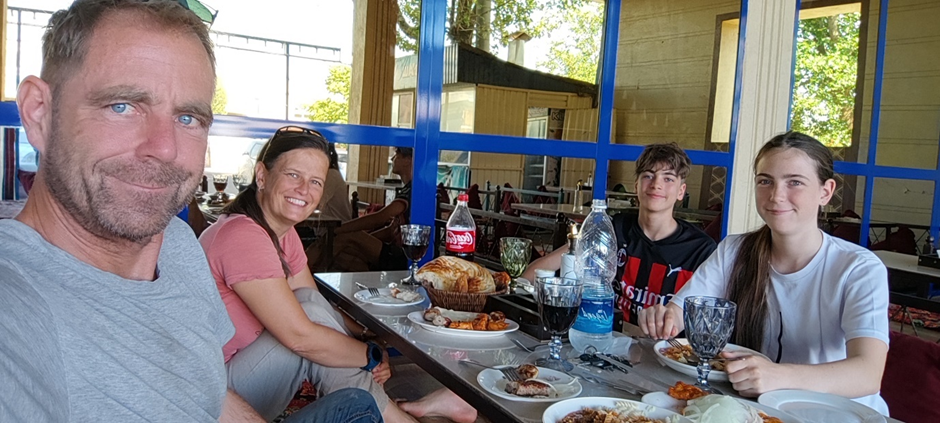 Früh Nachmittag hielten wir bei einem klassischen kirgisischen Restaurant neben der Straße zum Mittagessen an. Wir saßen traditionell auf dem Boden von einem erhöhten Podest und aßen Schaschlik mit Brot und Salat. Alles war frisch vorbereitet und sehr lecker.