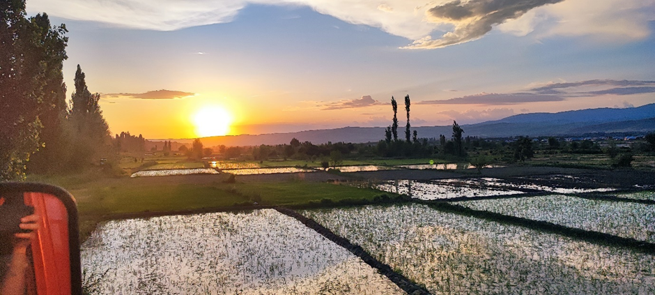 Der von Google vorgeschlagene Weg führte zweimal über die Grenze, erstmal von Kirgistan nach Usbekistan, danach von Usbekistan nach Kirgistan. Da wir aus Erfahrung wissen, dass jeder Grenzübertritt viel Zeit kosten kann (wir lernten die EU wirklich zu schätzen!), wollten wir diesem Weg nicht folgen. Wir dachten, es muss möglich sein, nach Osh zu fahren, ohne Kirgistan zu verlassen. Irgendwie machen es die Kirgisen auch. So war es. Vor dem Grenzübertritt bogen wir links ab und folgten der Straße, die direkt neben der usbekischen Grenze führte bis nach Osh.