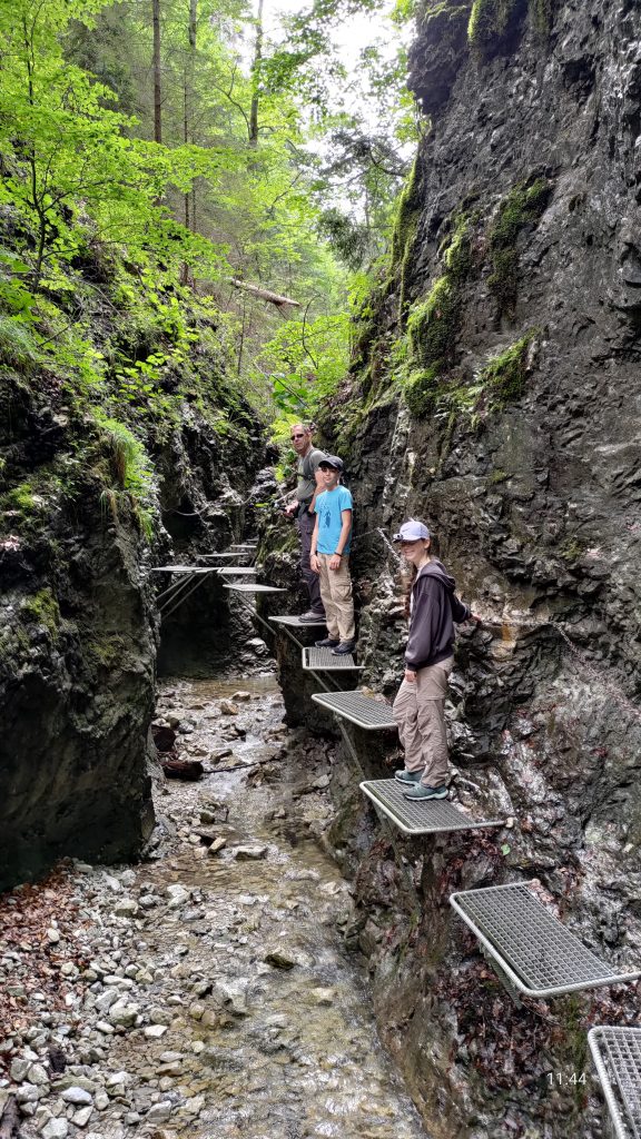Unser Weg führte mit Hilfe von Leitern, in die Felswand eingelassenen Metallgittern und Eisenketten an vielen Wasserfällen und Höhlen vorbei. Wir sind im Bachbett und im Wald gelaufen. Übrigens Bachbett. Natürlich musste unser Sohn schnell sein, wie eine Bergziege. Er war immer weit vor uns, manchmal haben wir ihn gar nicht mehr gesehen. Leider hat er allerdings nicht so eine Übung im Felsspringen wie eine Bergziege. Einmal ist er ausgerutscht und unsanft im Wasser gelandet. Leider ist er nicht nur nass geworden, sondern hat sich auch weh getan. Zum Glück war seine Verletzung aber nicht schlimm, und seine Klamotten trockneten auch schnell.