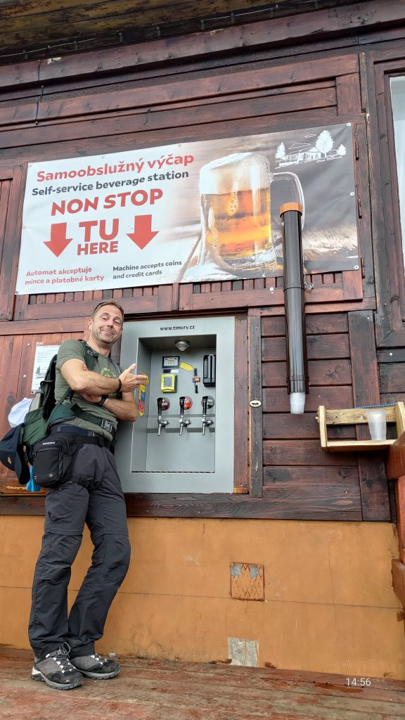 Oben am Berg angekommen haben wir uns erstmal mit unseren mitgebrachten Sandwiches und Wasser gestärkt. Danach spazierten wir weiter am Grat in Richtung Klastorisko. Klastorisko ist offensichtlich ein beliebtes Ausflugsziel mit einer Klosterruine und eine Gaststätte, die auch zum Glück offen war. Aber wenn sie geschlossen gewesen wäre, wäre es trotzdem kein Problem gewesen: Sie hatten in der Hauswand einen 24-Stunden Non-Stop Bierautomaten eingebaut gehabt! Ohne Personal, mit Selbstbedienung, Zahlung mit Kreditkarte. Was für eine Entwicklung! In Deutschland haben wir sowas noch nie gesehen.