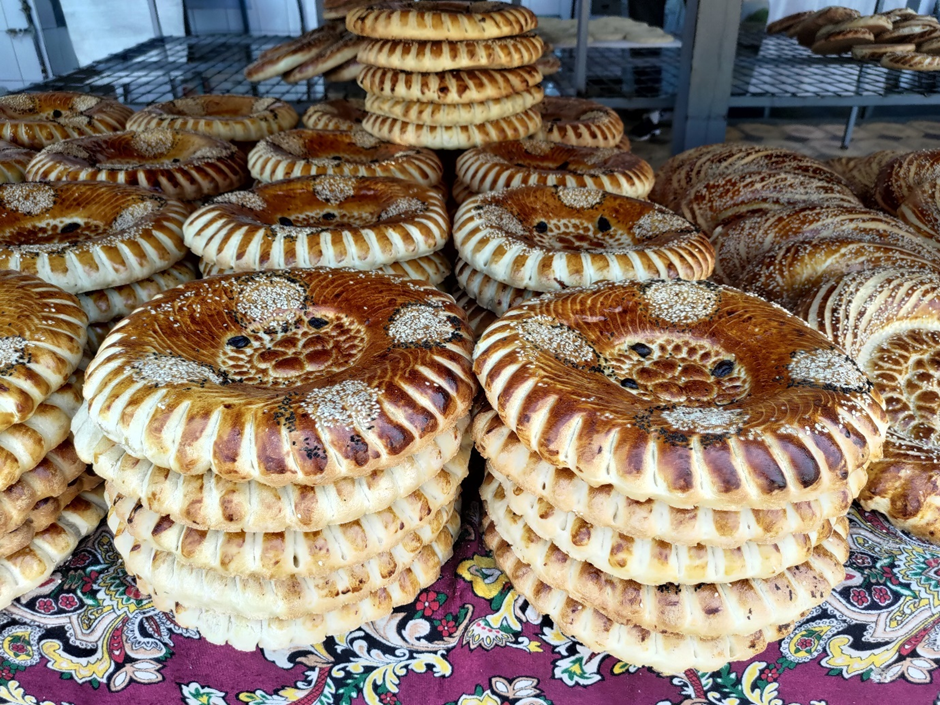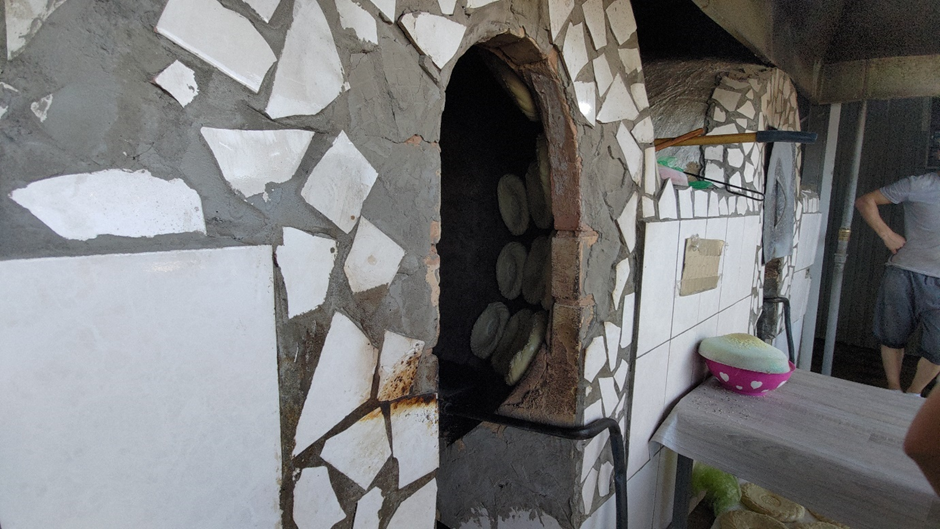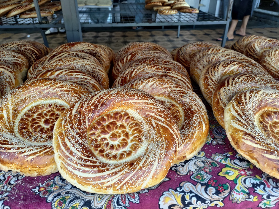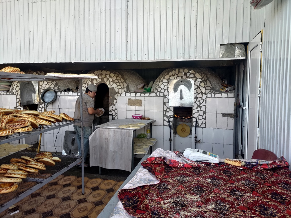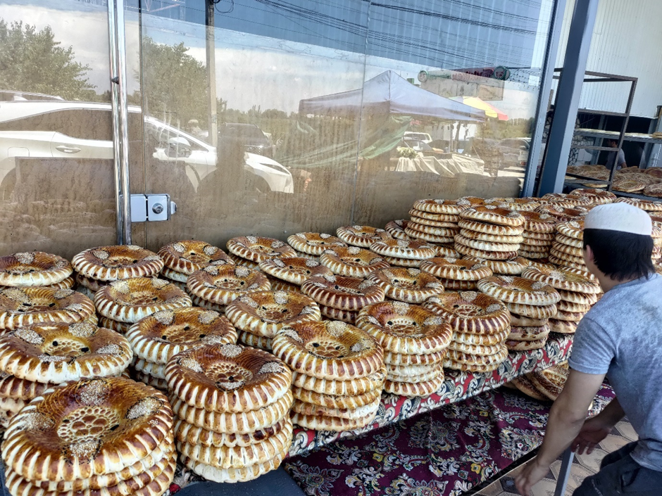 Als wir aufgestanden, sind waren John und Mariana schon unterwegs. Sie haben in ihrem Landcruiser kein Bad und nur eine Aussenküche und sie wollten irgendwo schön frühstücken gehen. Wir haben auch erst gemütlich gefrühstückt und uns auf dem Weg gemacht. Bevor wir Osh verlassen haben, fanden wir neben der Hauptstraße, die aus Osh nach Sary Tash führte viele Geschäfte. Wir hielten an und kauften eine große Melone und zwei von den leckeren und wunderschönen verzierten Fladenbroten, die direkt vor Ort in dem Ofen frisch gebacken waren.