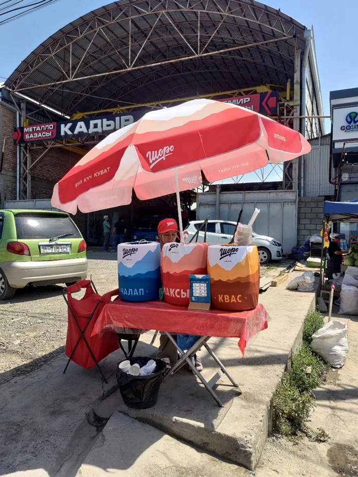 Wir haben endlich auch die Getränke probiert, die hier in Kirgistan in jeder Stadt auf der Straße aus Fässern verkauft werden. Es gibt immer 3 Getränke zur Auswahl: Chalap, Maksym und Kwas.