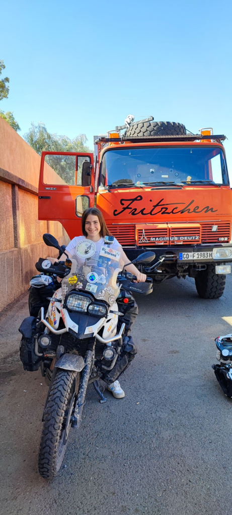 Heute wollten wir (weiterhin gemeinsam mit Steffi) einen Ausflug nach Jubbah machen. Vor der Fahrt hat Mira Steffis Motorrad ausprobiert: