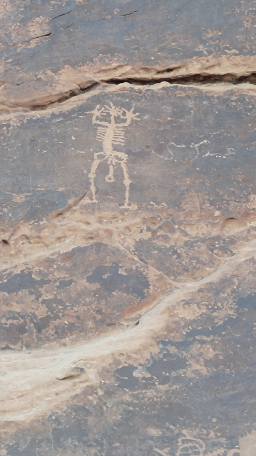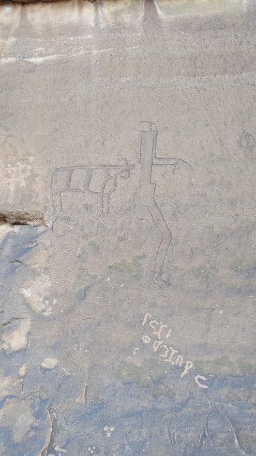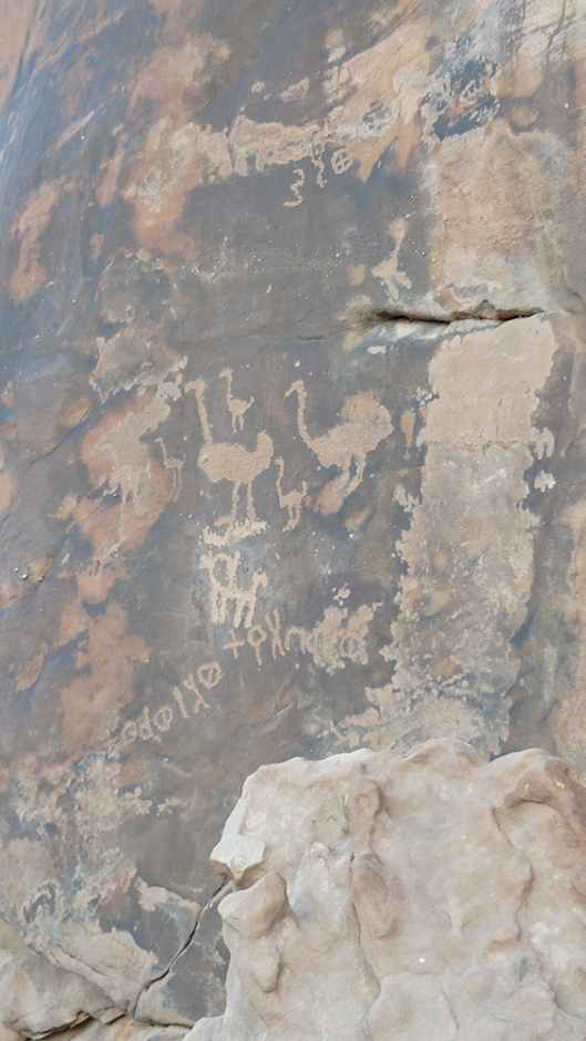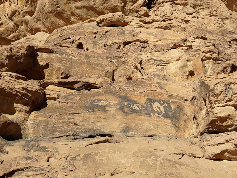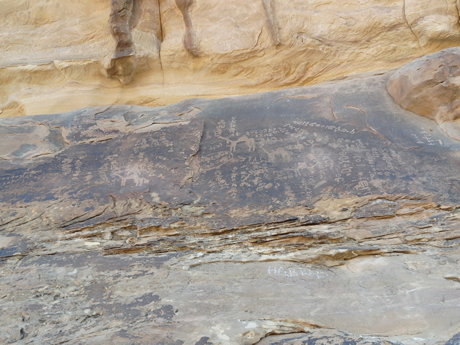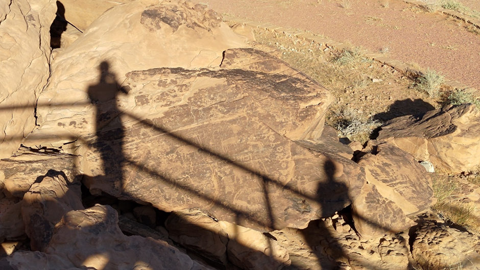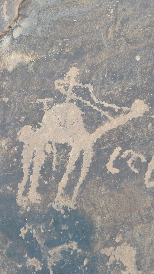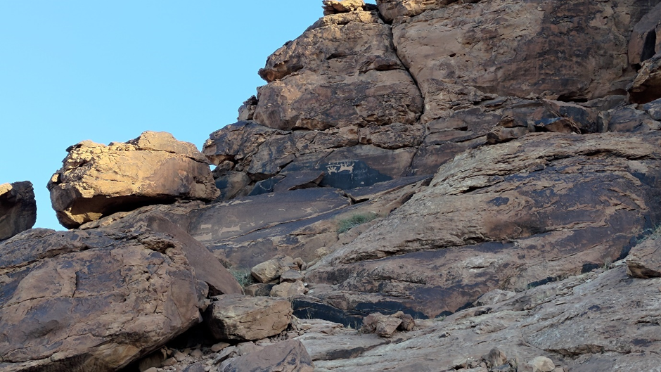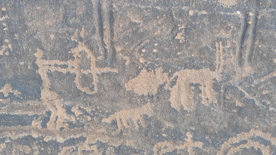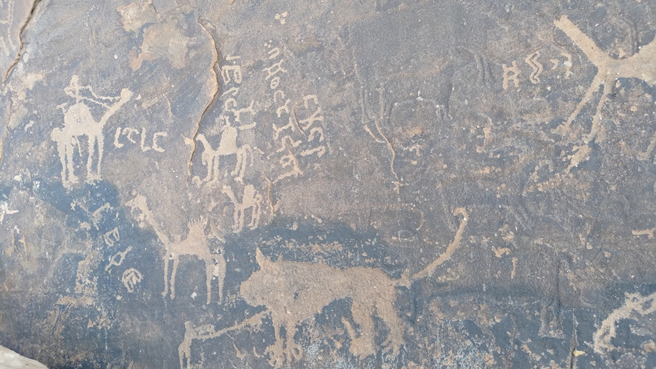 Auf den Felsen um Jubbah befinden sich unglaublich viele prähistorische Petroglyphen. Diese in Stein gehauenen Zeichnungen sind mindestens 7-9 Tausend Jahre alt. Sie stellen Tiere wie Kamele, Oryxantilopen, Gazellen und Straußvögel sowie Menschenfiguren und Jagdszenen dar. Es hat echt Spaß gemacht, den Gegend zu erkunden, die einzelnen Zeichnungen auf den Wänden zu suchen und versuchen herauszufinden, was sie darstellen.